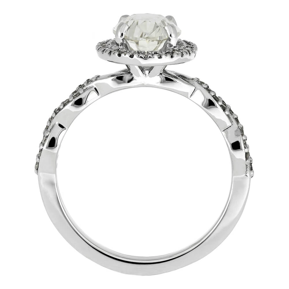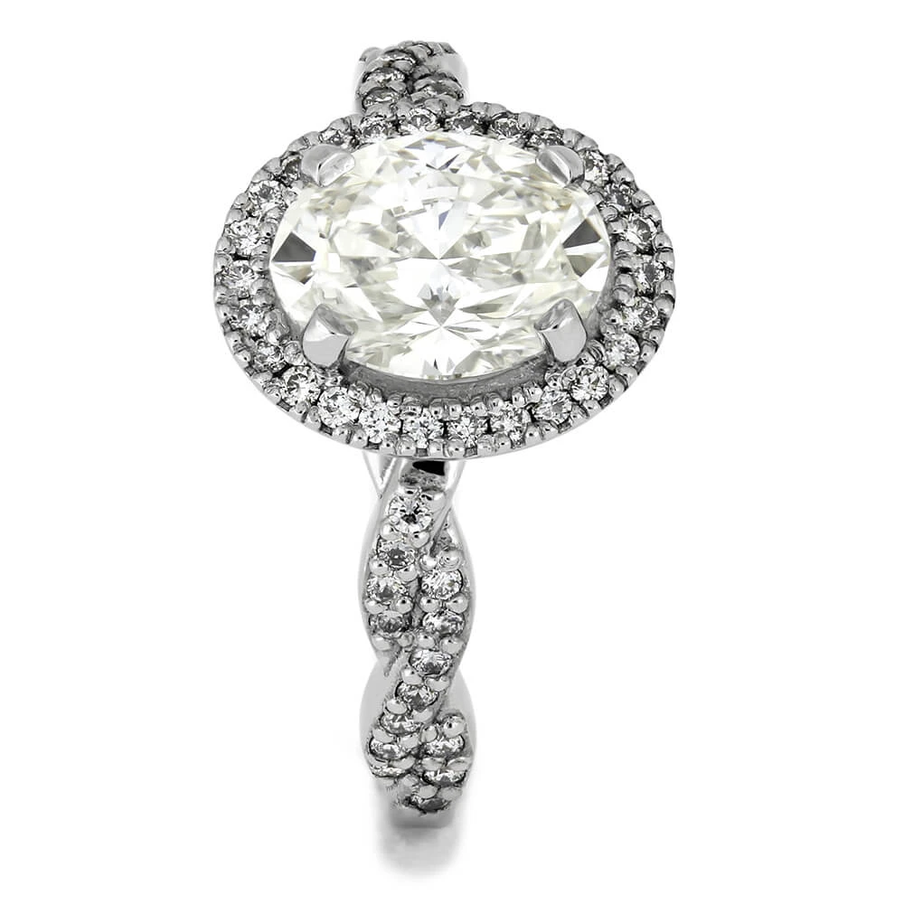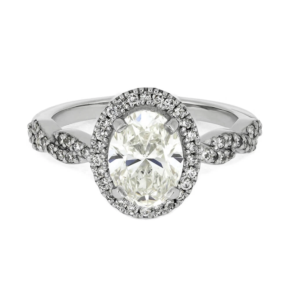 A gorgeous diamond oval halo surrounds the four-prong center stone in this platinum engagement ring. Order a matching wedding band to compliment this stylish halo engagement ring. Craft the diamond engagement ring of your dreams with our custom design team!