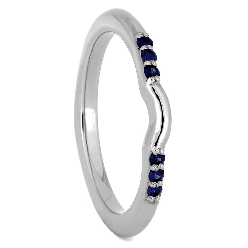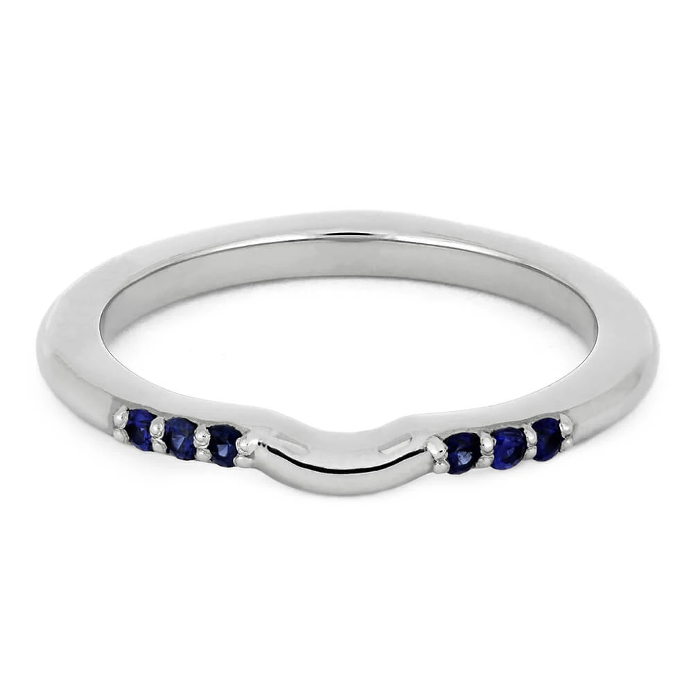 This blue sapphire shadow band can be customized to fit perfectly against your engagement ring. Six genuine blue sapphires give this ring it’s flair, and can be exchanged for other stones if you wish to customize this ring (while changing the price).