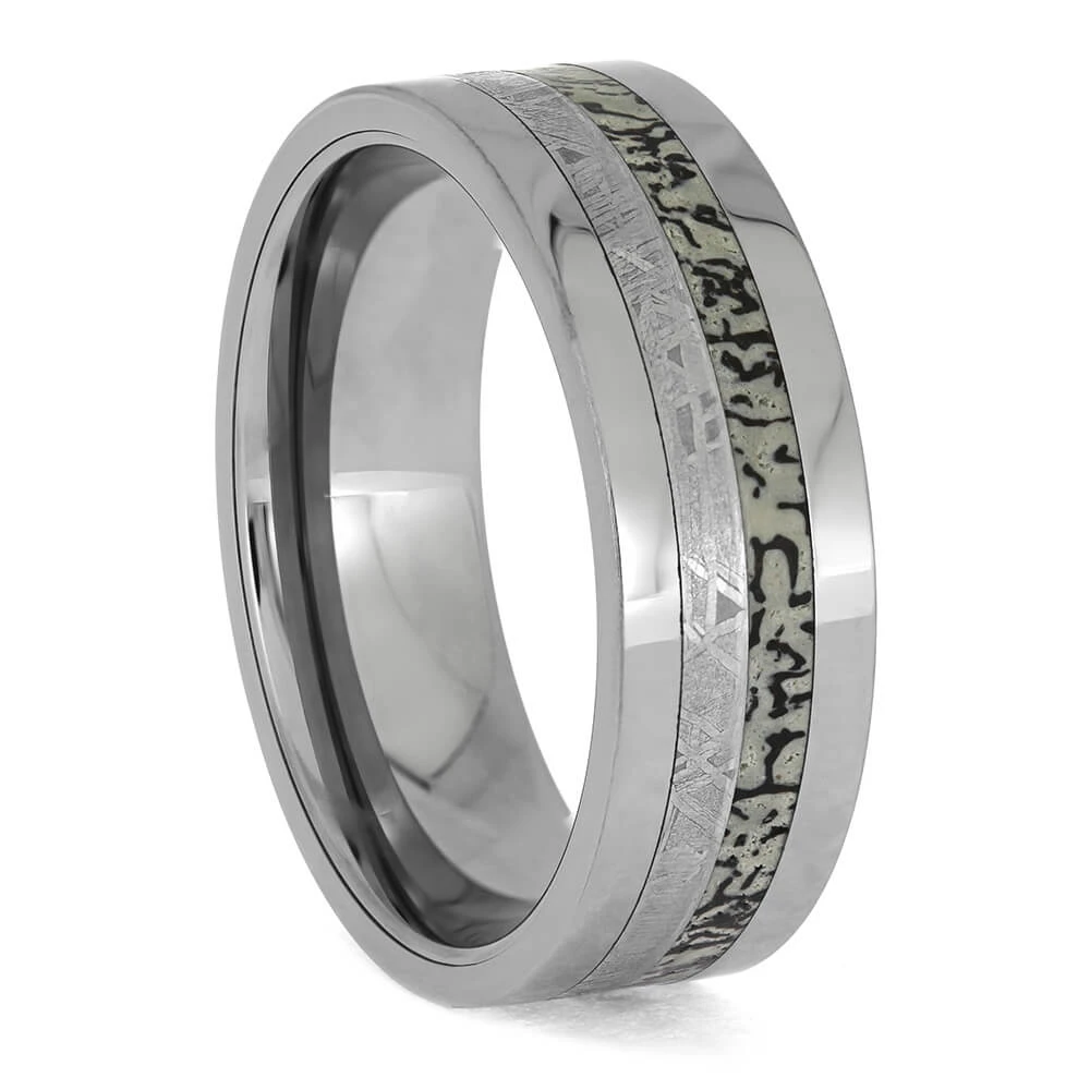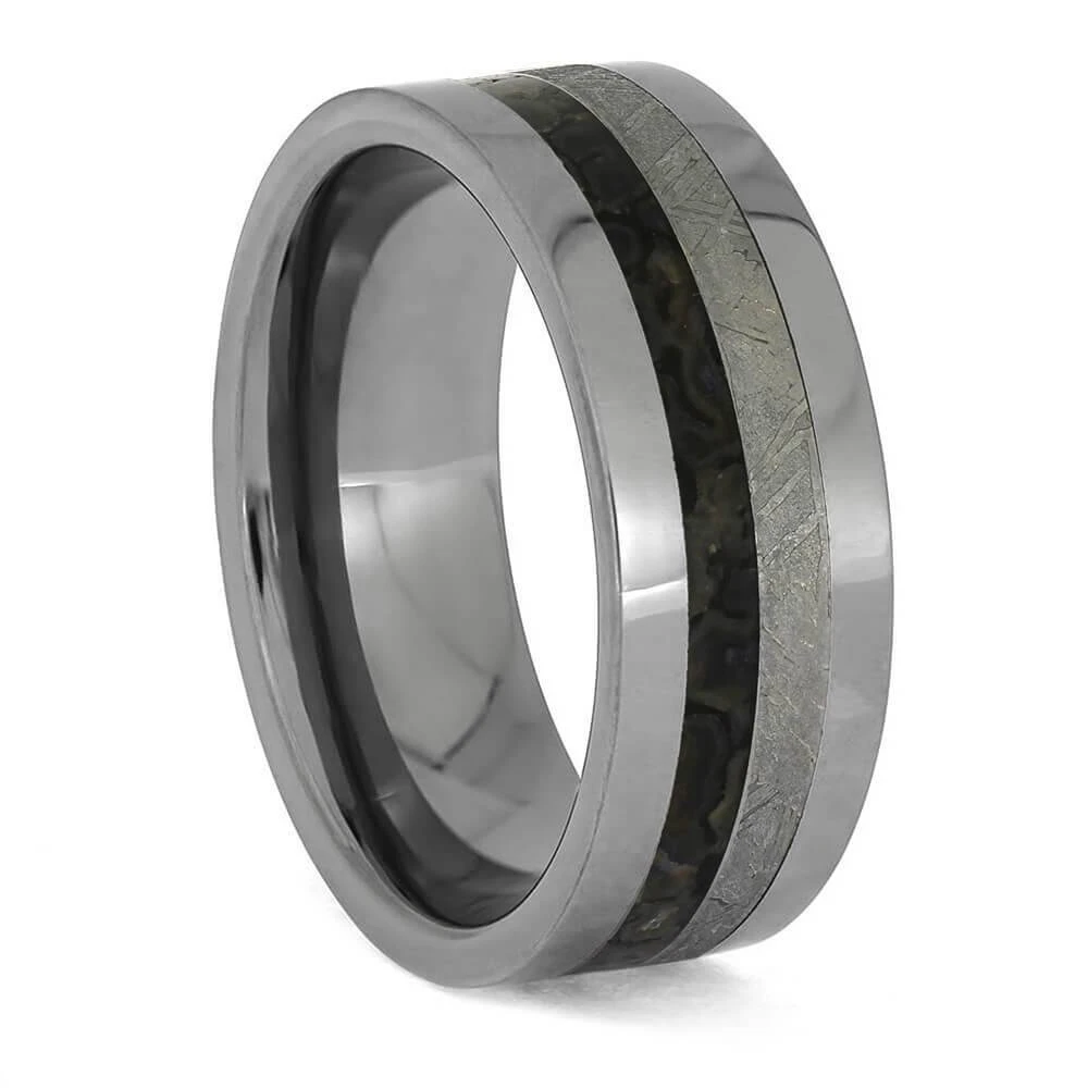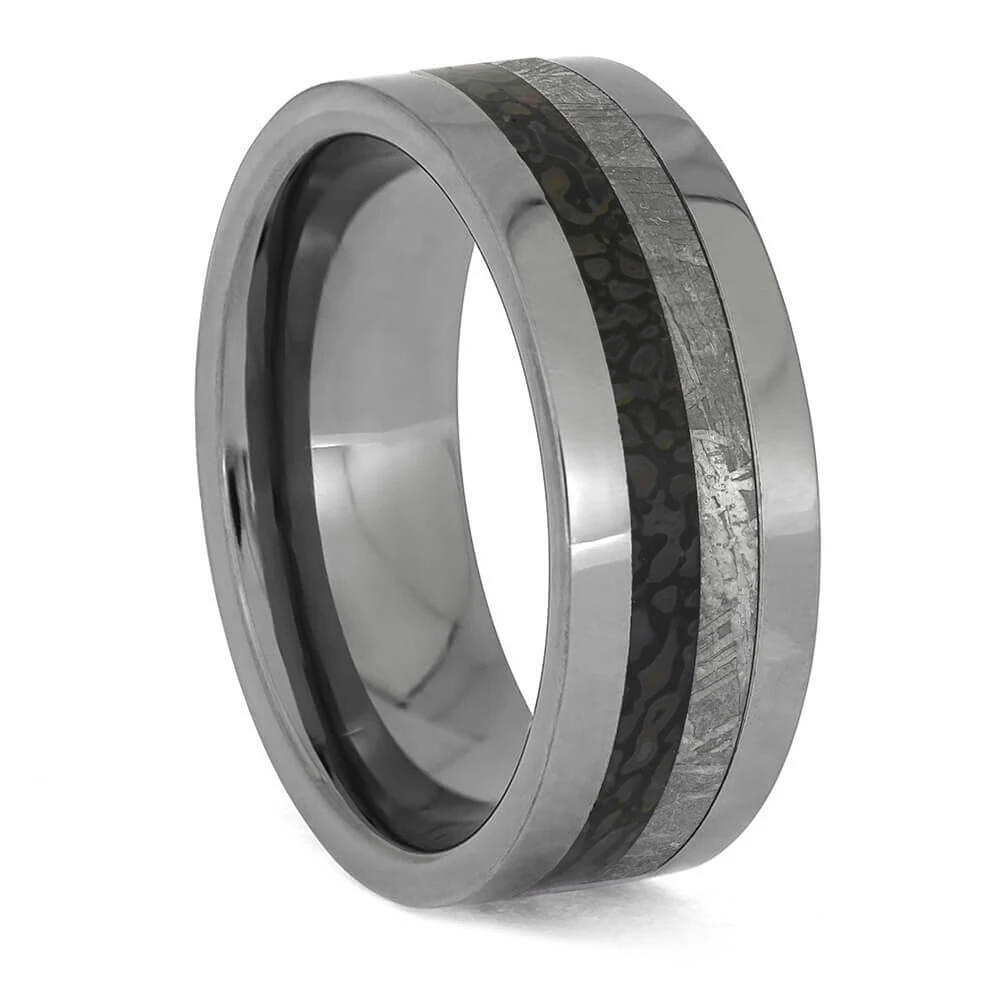 The unique coloration in this dinosaur bone spans the spectrum. Set next to shiny meteorite and tungsten, the gembone really pops. Any man would be proud to wear this one of a kind ring.
