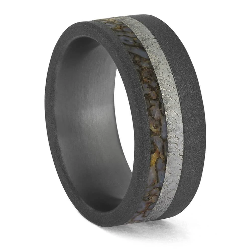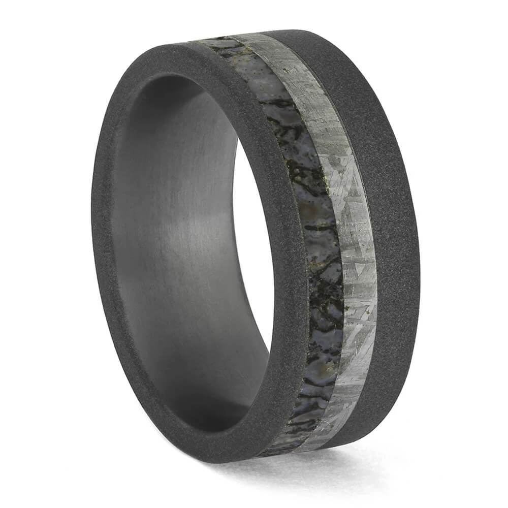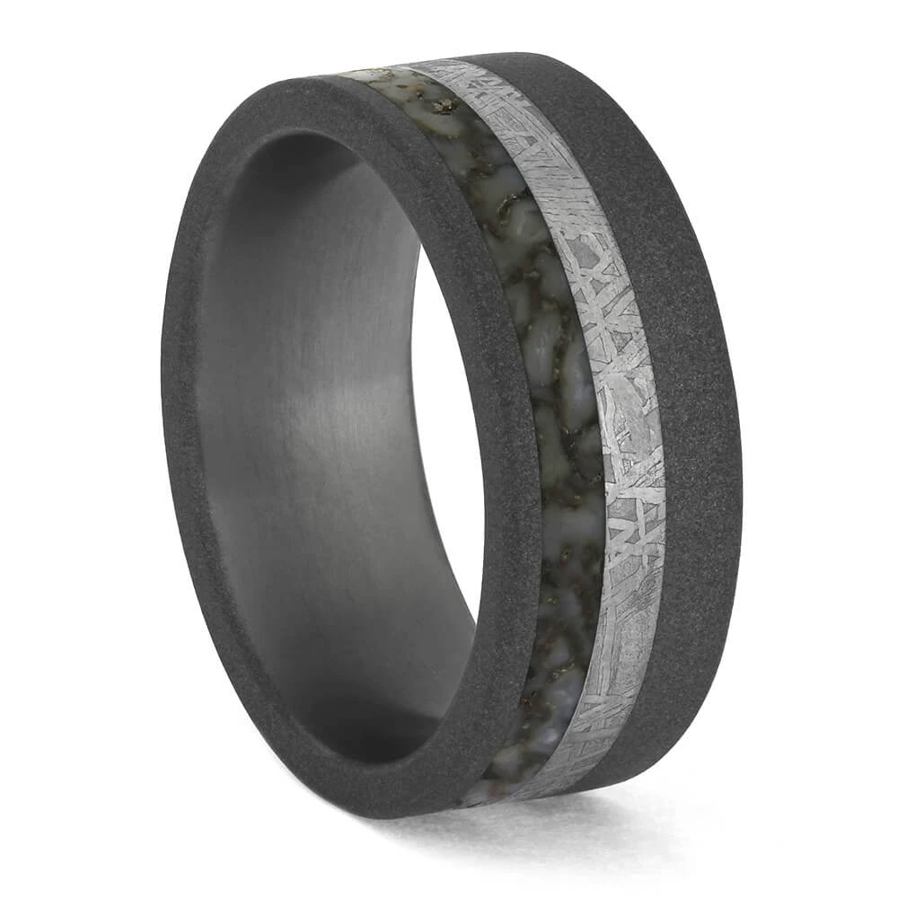 The premium-colored gembone combined with the metallic silver of the meteorite really stand out from the muted tone of the sandblasted titanium in which they are set.