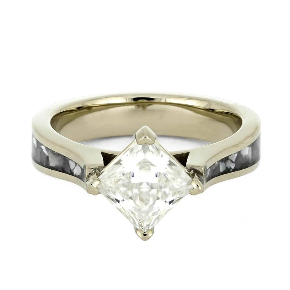 Gorgeous mother of pearl is inlaid in the solid gold band of this solitaire, square cut moissanite engagement ring. Pearl doesn’t have to be the center stone to be beautiful, as seen in this alternative engagement ring.