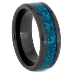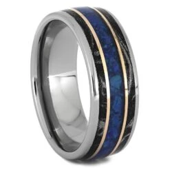 Black Fire Opal Ring With Dinosaur Bone And Meteorite Inlays