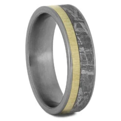 Aspen Wood Wedding Ring Set, Yellow Gold Moissanite Engagement With Meteorite Wedding Band