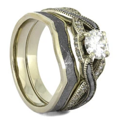 Meteorite Bridal Set, Three Stone Moissanite Ring & Matching Band