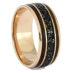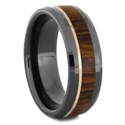 Wood And Black Ceramic Wedding Band With Rose Gold Pinstripe