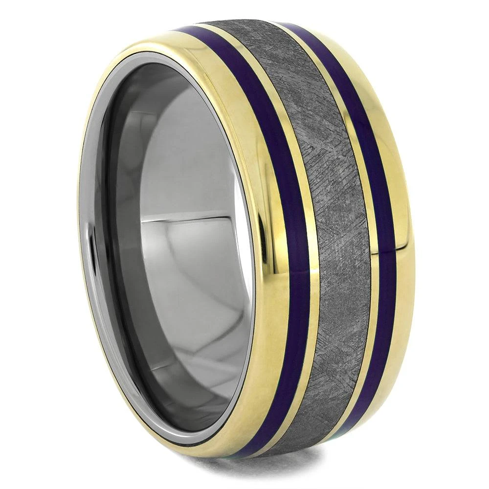 For a stellar groom whose favorite color is purple, or maybe they’re a fan of our local NFL team the Minnesota Vikings! This wedding band in made with a titanium sleeve, and features an inlay of authentic Gibeon meteorite framed by polished pinstripes of gold and purple enamel on either side.