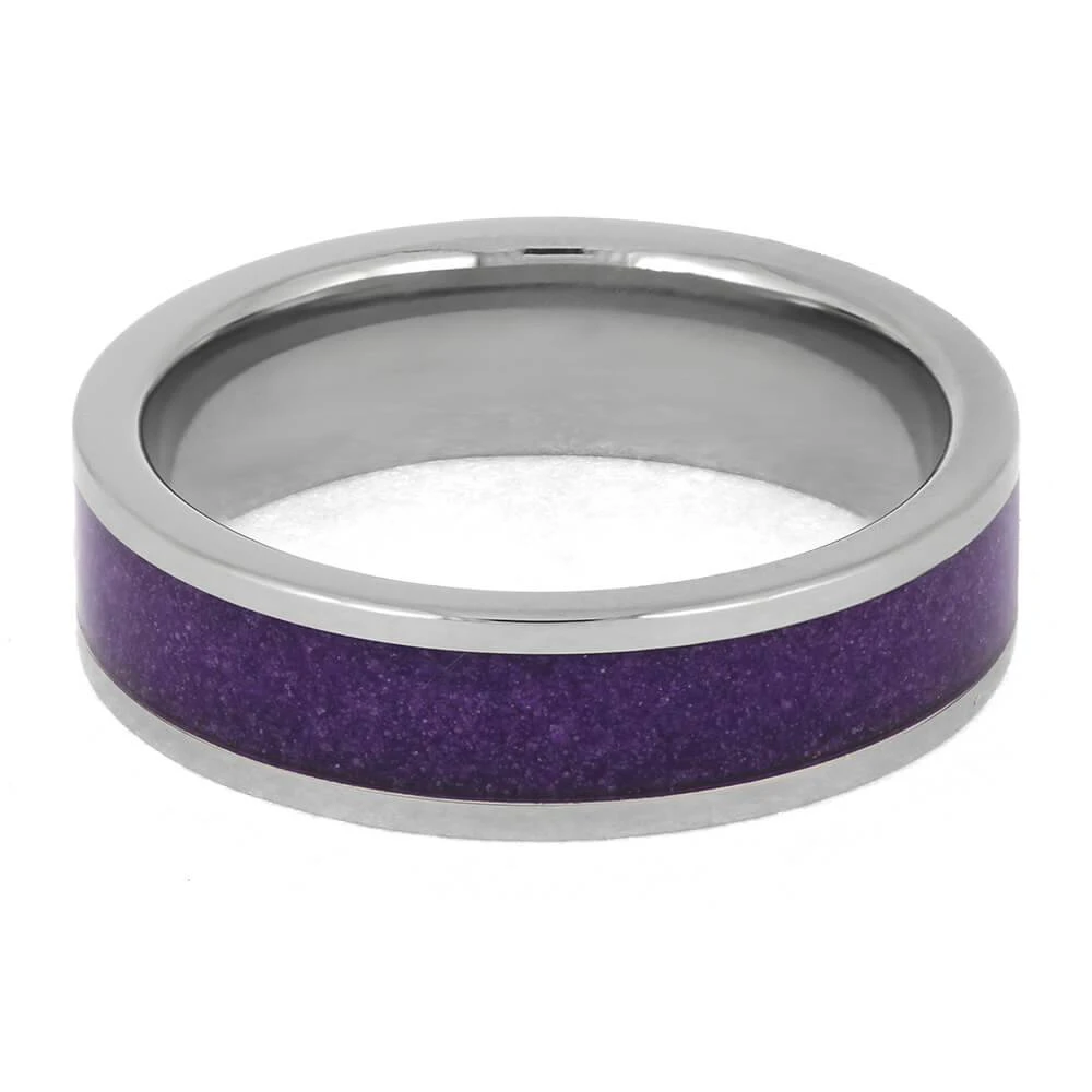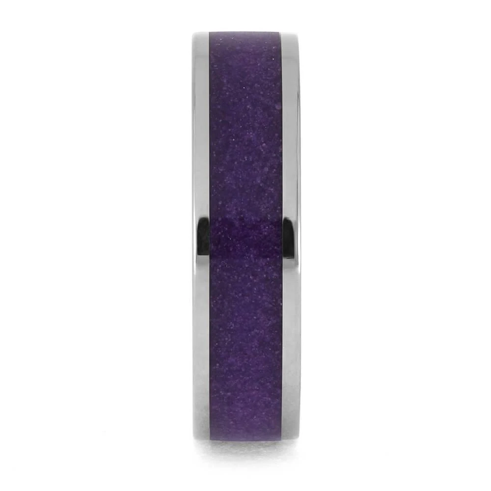 This unisex titanium wedding band features a vibrant inlay of purple sand, adding a touch of color and modernity. Skillfully crafted by hand, the ring showcases the natural beauty of purple sand in a sleek and polished design. This ring is handmade in the USA!