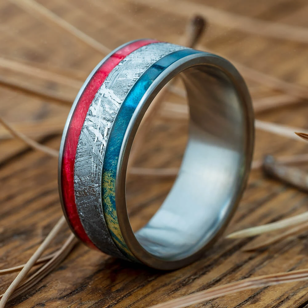Display a unique style with this red and blue box elder burl wood ring. This men’s wedding band has real Gibeon meteorite between the colorful woods and is hand-crafted with titanium. The sleeve comes with a matte finish for rugged durability.