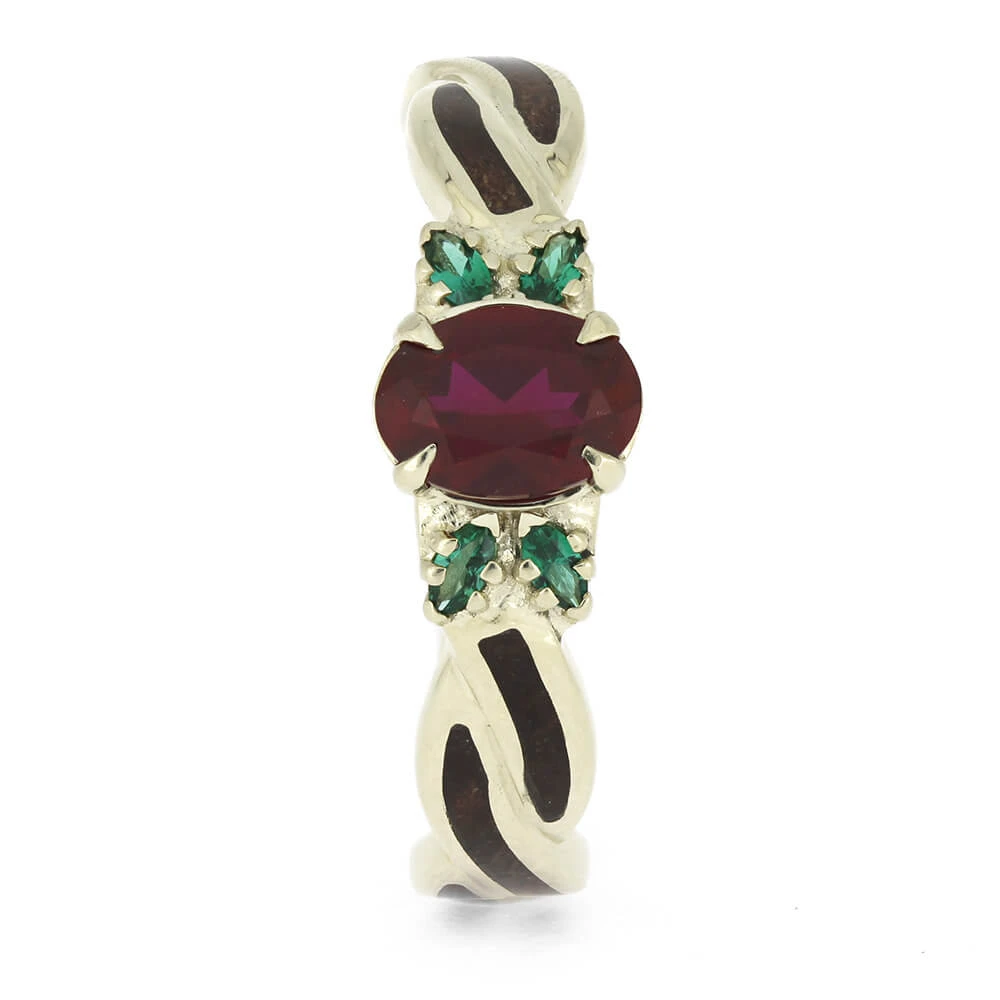 Make a bold statement with a ruby engagement ring crafted in 14k white gold. The unique design features an intricate twisting band with four emerald side stones, adding a natural element to this three stone style ring.