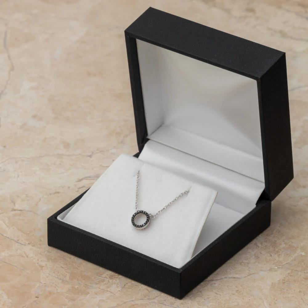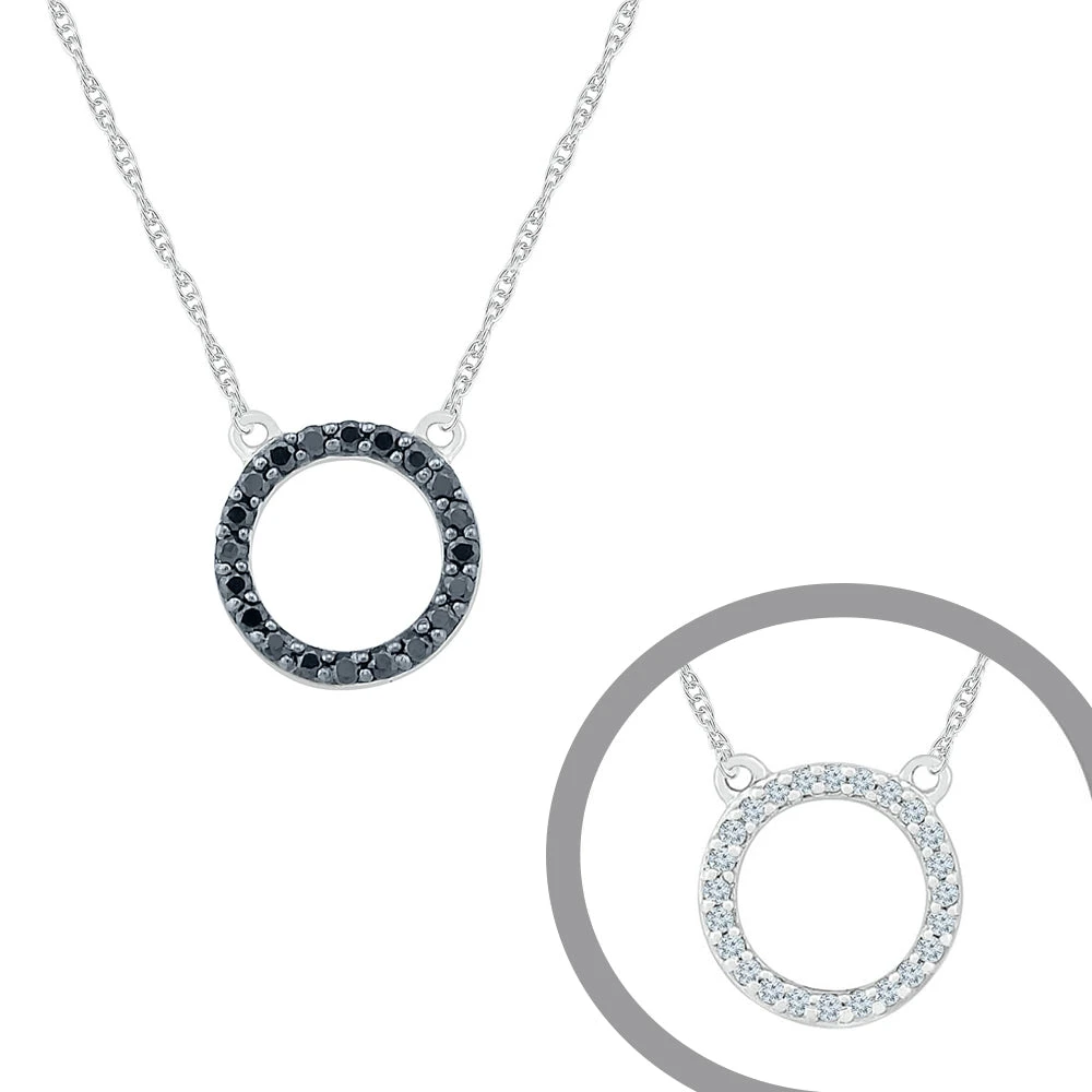 This amazing, reversible diamond necklace is actually TWO necklaces in one! On one side, it features an endless circle of white diamonds. Flip it over and it has black diamonds. Expertly crafted in sterling silver or gold on an 18″ rope chain.