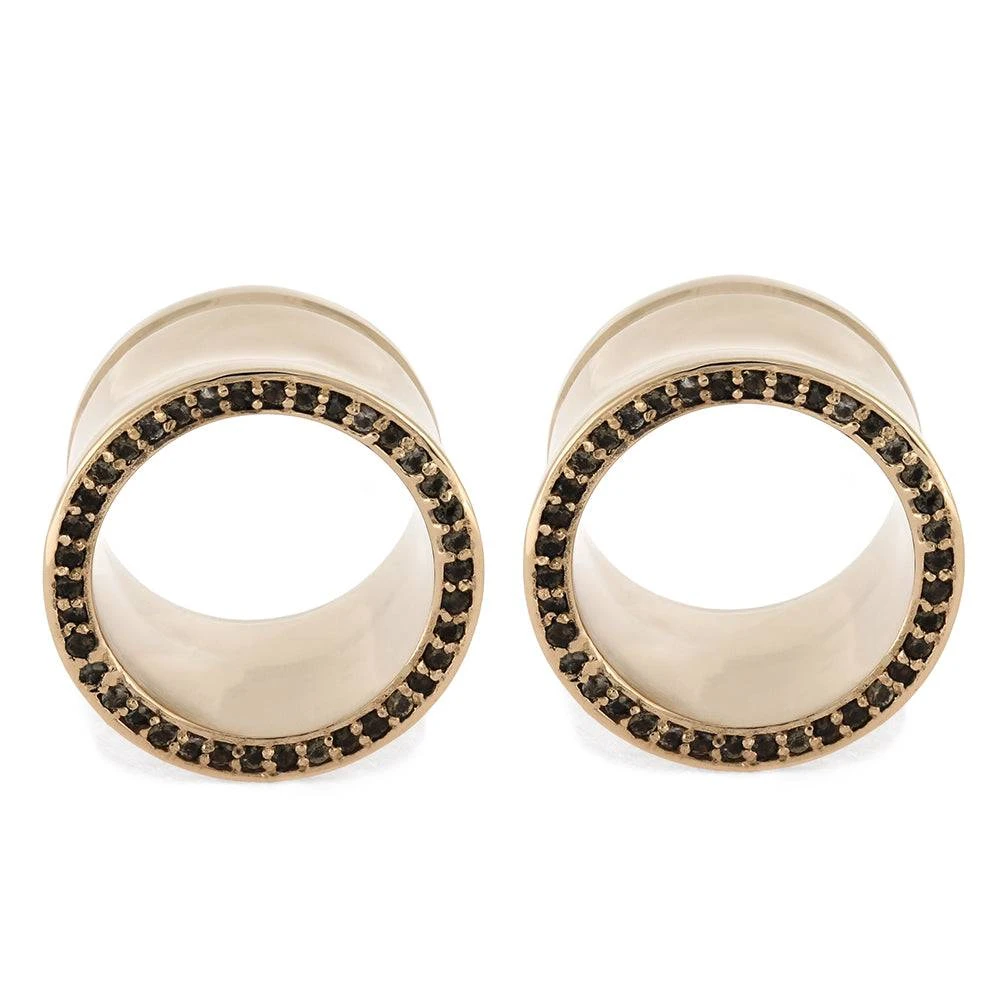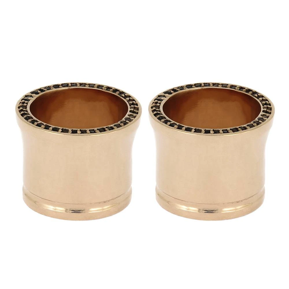 A ring of smoky quartz stones decorate the ring of these rose gold ear gauges. The polished finish helps highlight the dark accent stones. The flush set smoky quartz stones are only on one side of the gauges. Turn heads with these handmade quartz ear gauges!
