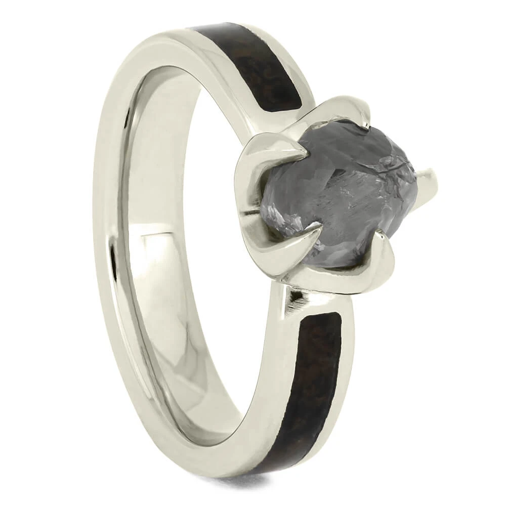 This fantastic rough diamond engagement ring features a rare, stunning dinosaur bone inlay. The fossilized gembone is a testament to timeless love. Contrasting 14k white gold gleams around the 65 million year old fossil.