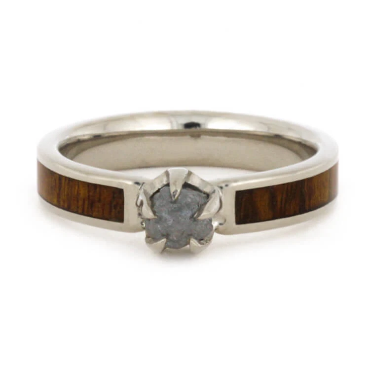 A rough diamond engagement ring like none other, this 14k white gold band will fill her with joy! The rough cut diamond, in a five-prong setting, is a perfect pairing to the natural ironwood.