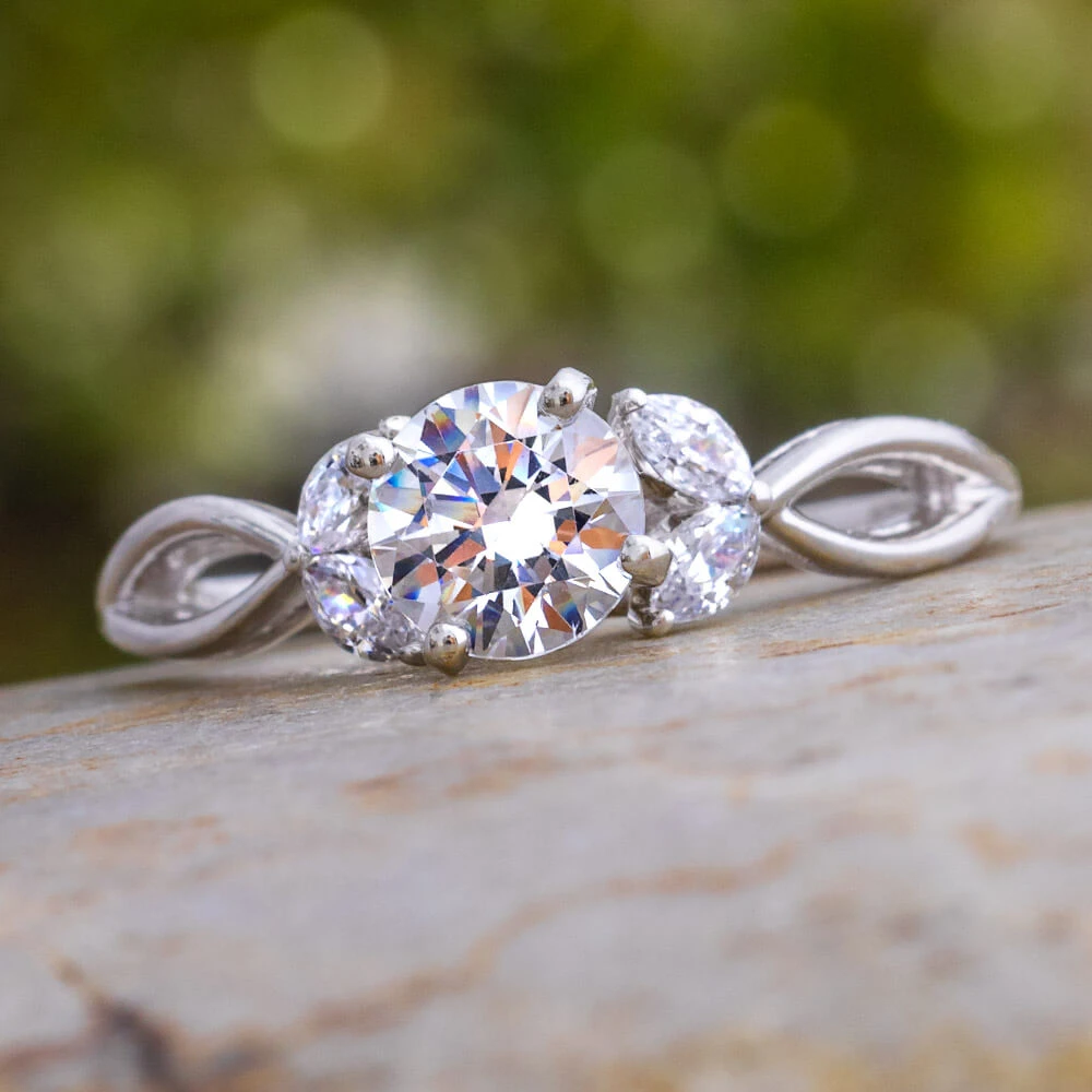 This white gold engagement ring features a gorgeous, round cut moissanite in a 4-prong setting. Marquise cut diamond accent stones provide a symmetrical frame that resembles sparkling leaves.