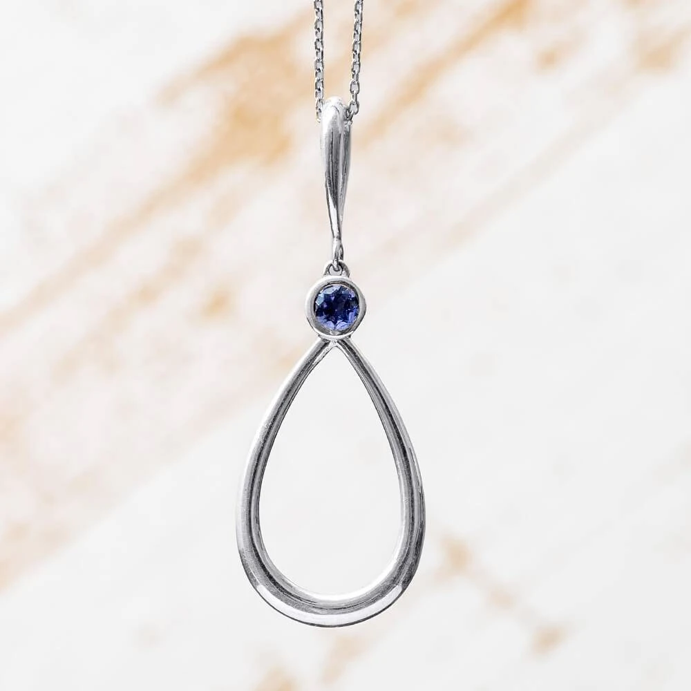 This unique necklace consists of a beautiful Iolite gemstone right on top of beautifully crafted tear drop shape. Buy this pendant to pair with a chain in your very own collection!! Perfect gift for any occasion. Available only in Sterling Silver.