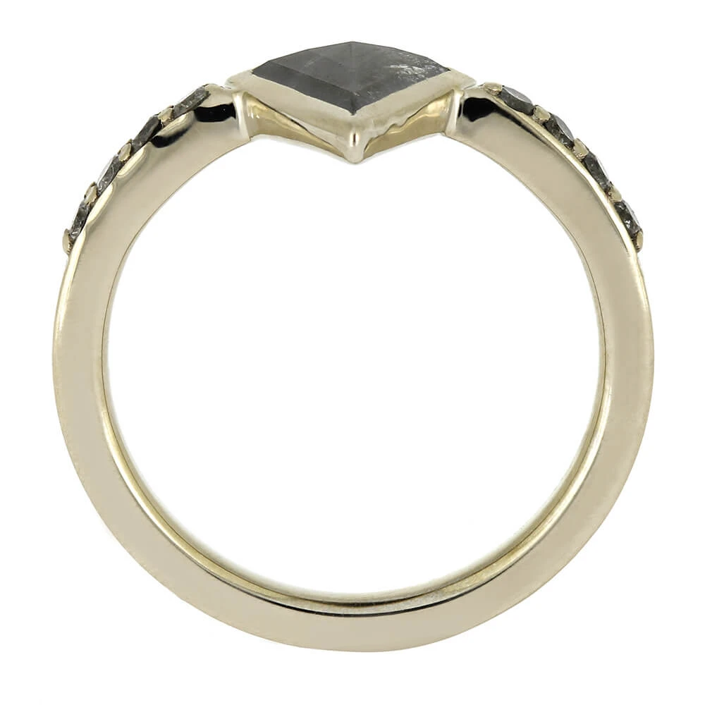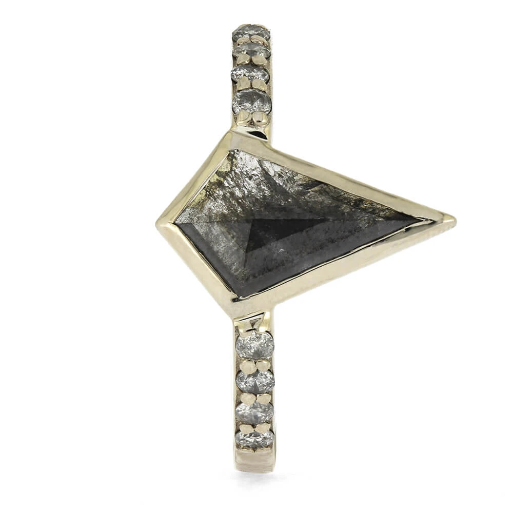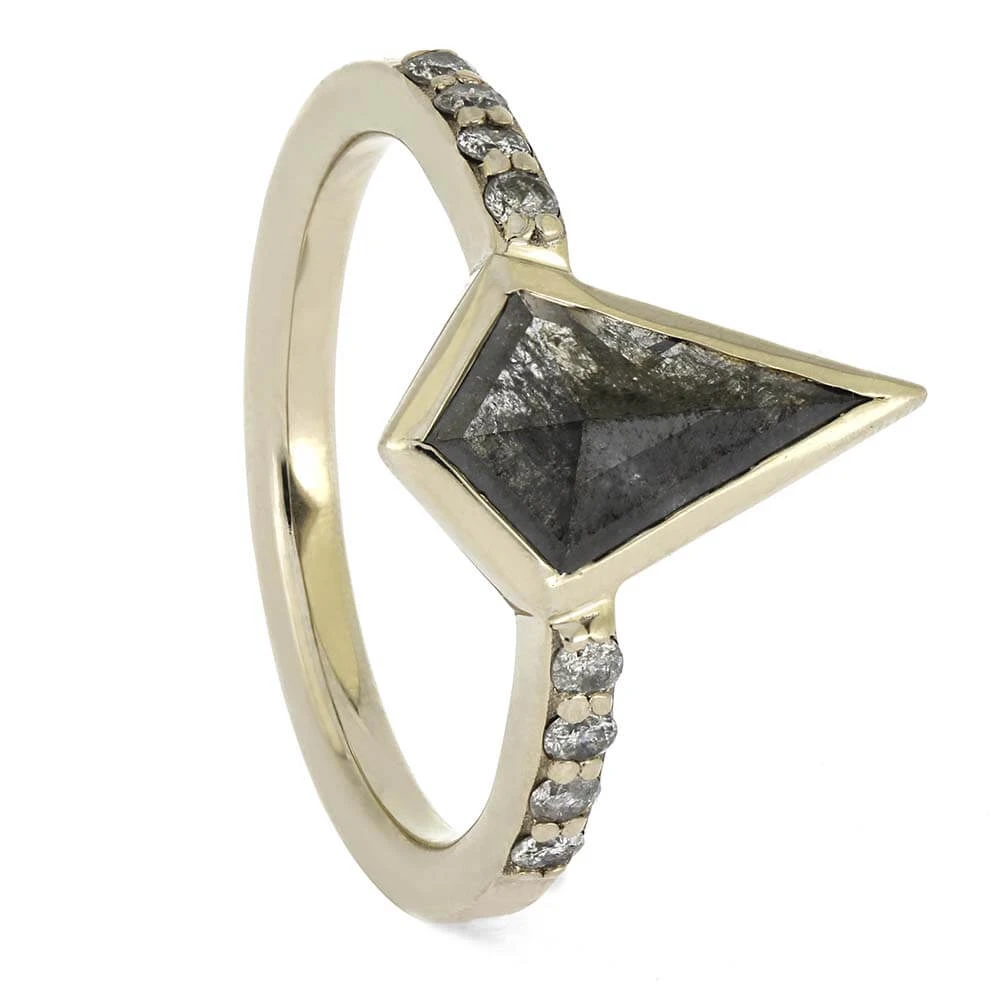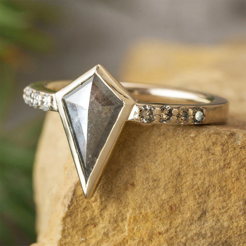 This exceptional engagement ring showcases a distinctive salt and pepper diamond complemented by brilliant colorless diamonds. The striking kite-shaped centerpiece creates a sophisticated alternative to conventional designs, offering a truly one-of-a-kind statement piece for those seeking an extraordinary engagement ring design.