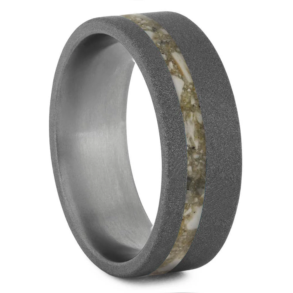 Whether it’s a memento from your trip to the Mediterranean or a souvenir from the Hawaiian Islands, send me your sand specimen and I will make it into your very own nostalgic ring! This band is fashioned in durable titanium. To add to the sand theme the titanium is treated with a sandblasted finish rending a darker charcoal exterior.