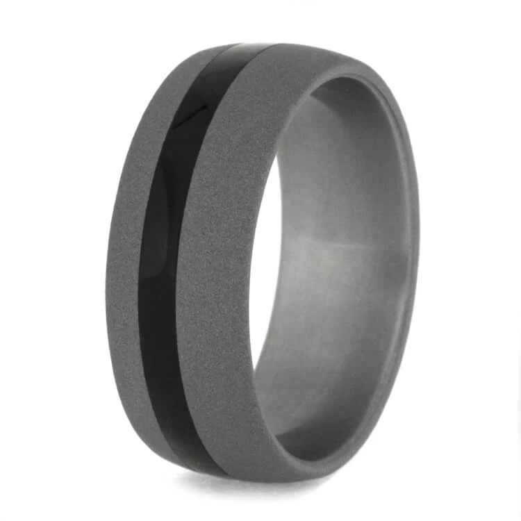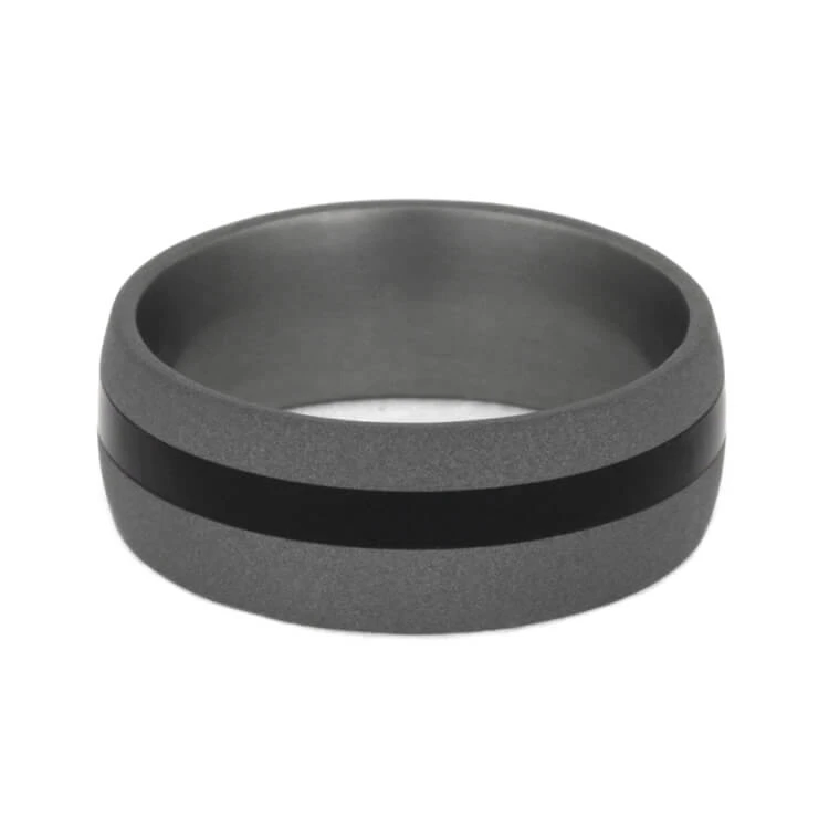 A mysterious ebony wood pinstripe is offset on this masculine sandblasted titanium wedding band. The sandblasted finish gives this ring a charcoal and rugged look.
