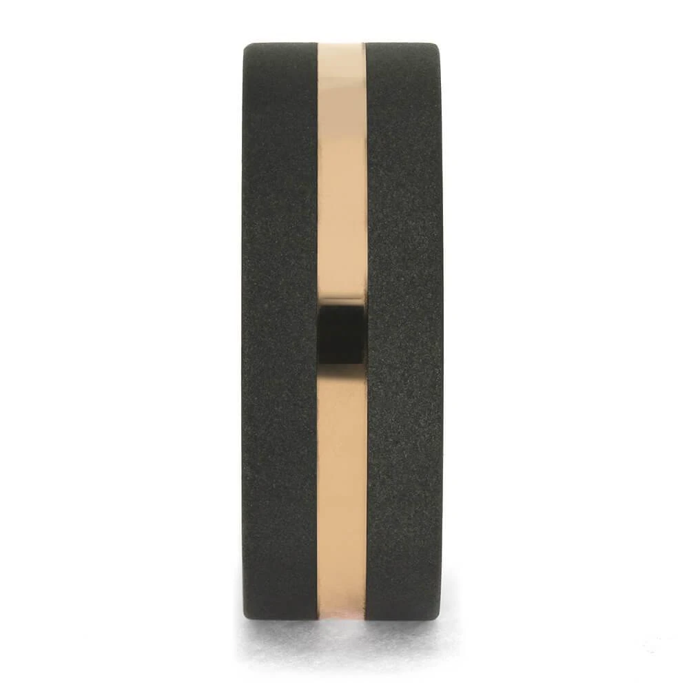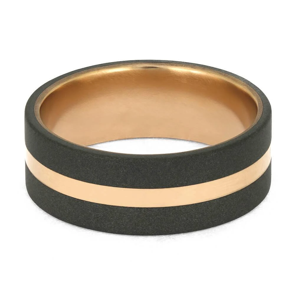 This sandblasted titanium wedding band is designed for the man with a timeless, minimalist aesthetic. Handmade with a polished 14k rose gold pinstripe, it’s the perfect blend of classic yet subtle sophistication. Enjoy a lasting style and commitment to quality with this handcrafted wedding band.