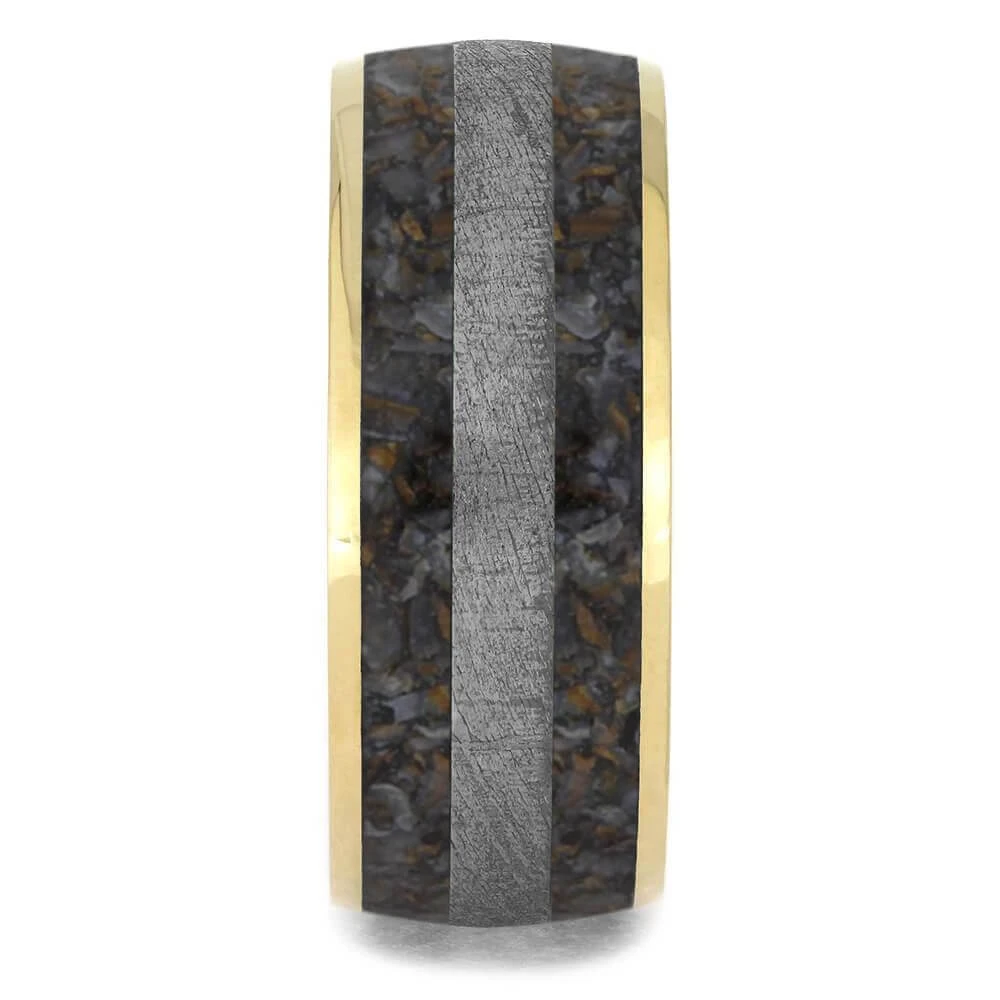 Two extraordinary materials come together in a bed of solid yellow gold to form this amazing, alternative men’s wedding band. From prehistoric times, underground for millions of years, two colorful dinosaur bone inlays, and from the confines of space, Gibeon Meteorite lines the center.