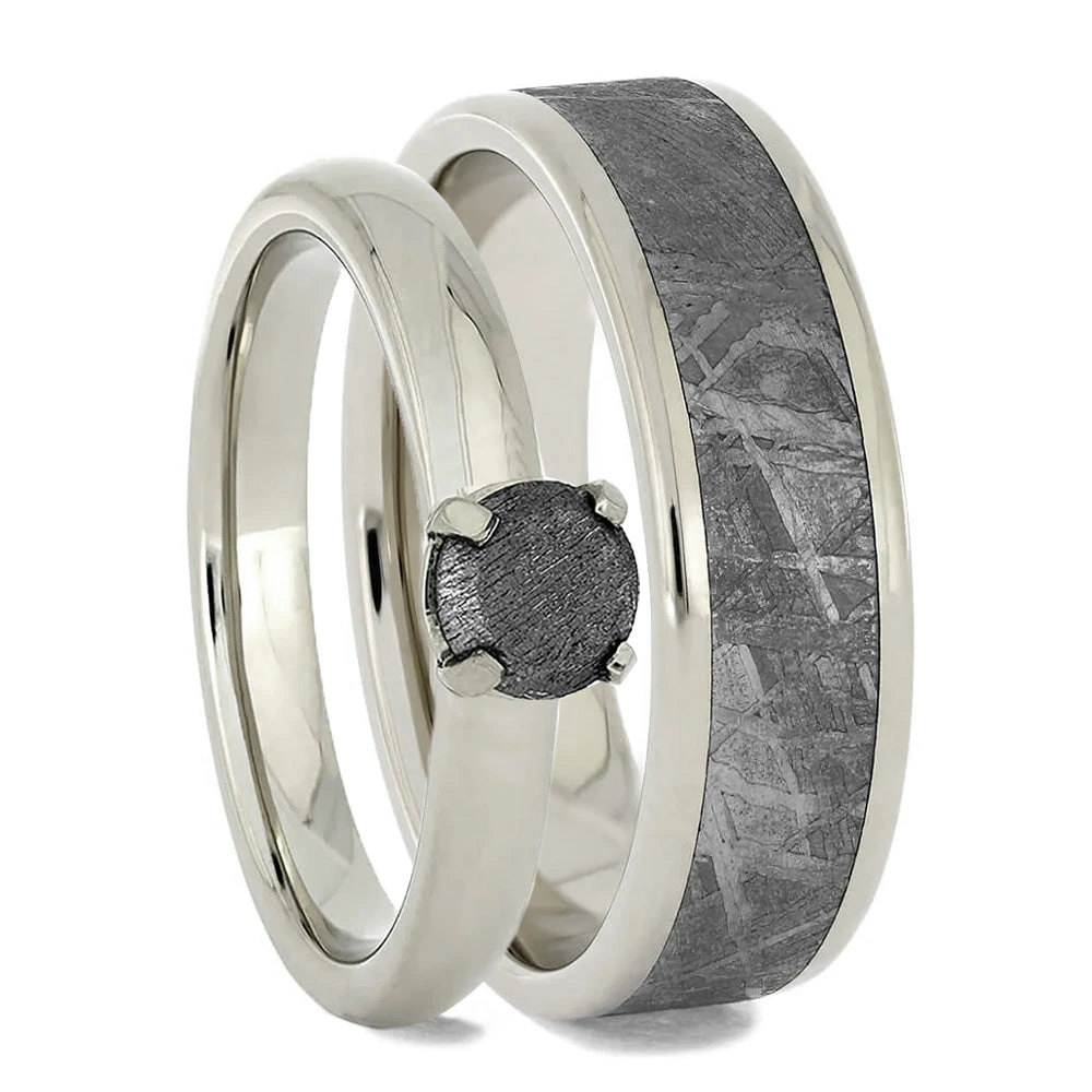 This is a stellar meteorite wedding ring set for that couple who is interested in astronomy and space. This ring set comes with a Gibeon meteorite stone engagement ring in a solitaire style in 14k white gold. The men’s wedding band is also inlaid with Gibeon meteorite and 14k white gold for a matching look.