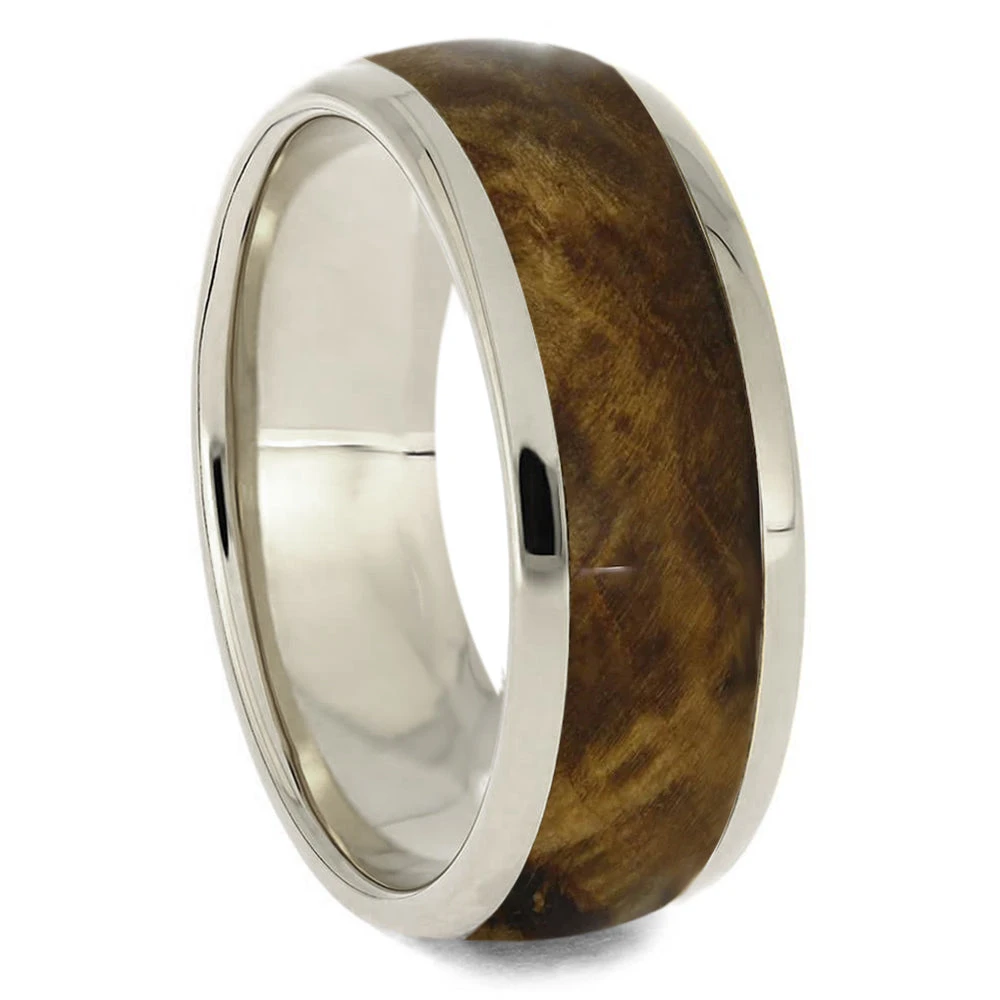 This nontraditional, solid gold ring features a beautiful black ash burl wood inlay. The 14k white gold and wood grain contrast in a wonderful way, combining sleek precious metal with a natural pattern. Show off your love of nature with an eco-friendly, durable and water-resistant wood ring!