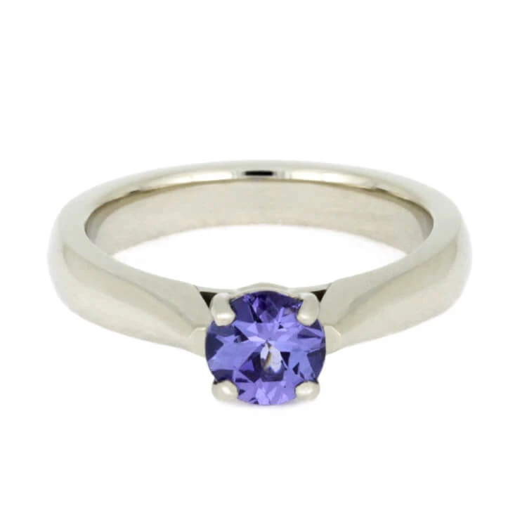 A magnificent round cut tanzanite gemstone sits on this solitaire 14k white gold engagement ring. On each side of the ring’s four-prong setting is a beautiful princess cut diamond adding just the perfect amount of sparkle on each side. If her birthstone is a Tanzanite (December) or her favorite color is purple, then this beautiful gemstone engagement ring is the one for her.