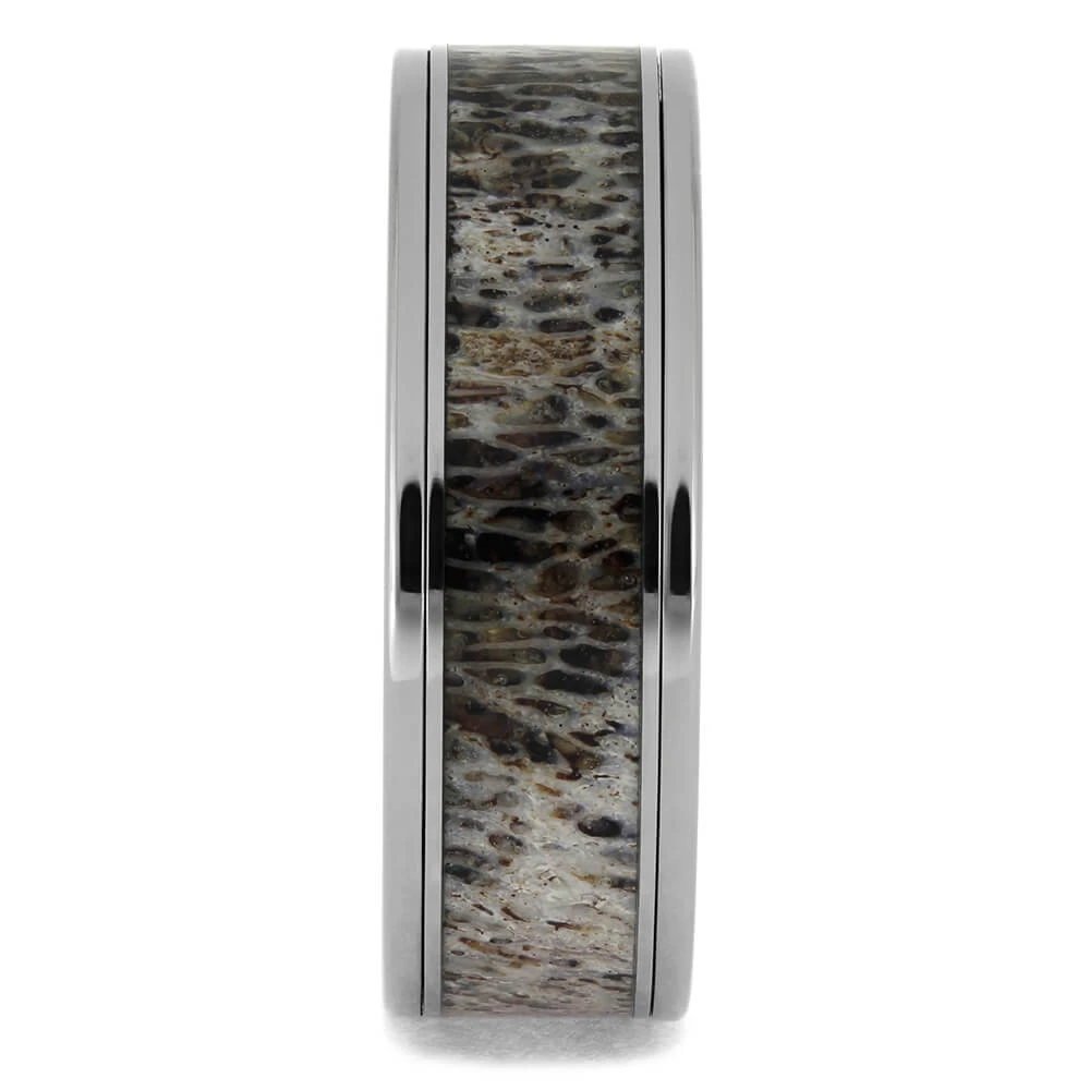 This is not just another antler wedding band. I have created a spinner ring with my signature deer antler inlay! The inner antler ring is able to spin freely around the metal sleeve.