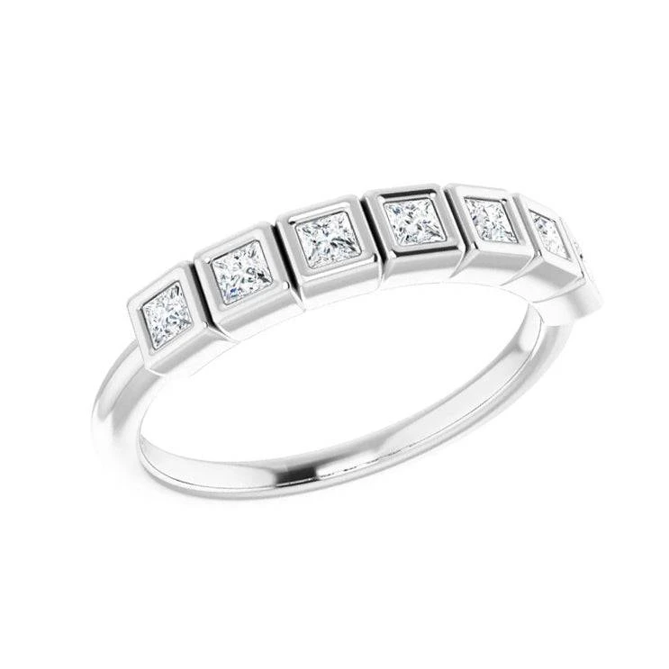 A row of seven princess cut diamonds stun in this half eternity ring. Each natural diamond is nestled in a bezel setting. Wear alone or with other square cut diamond rings.