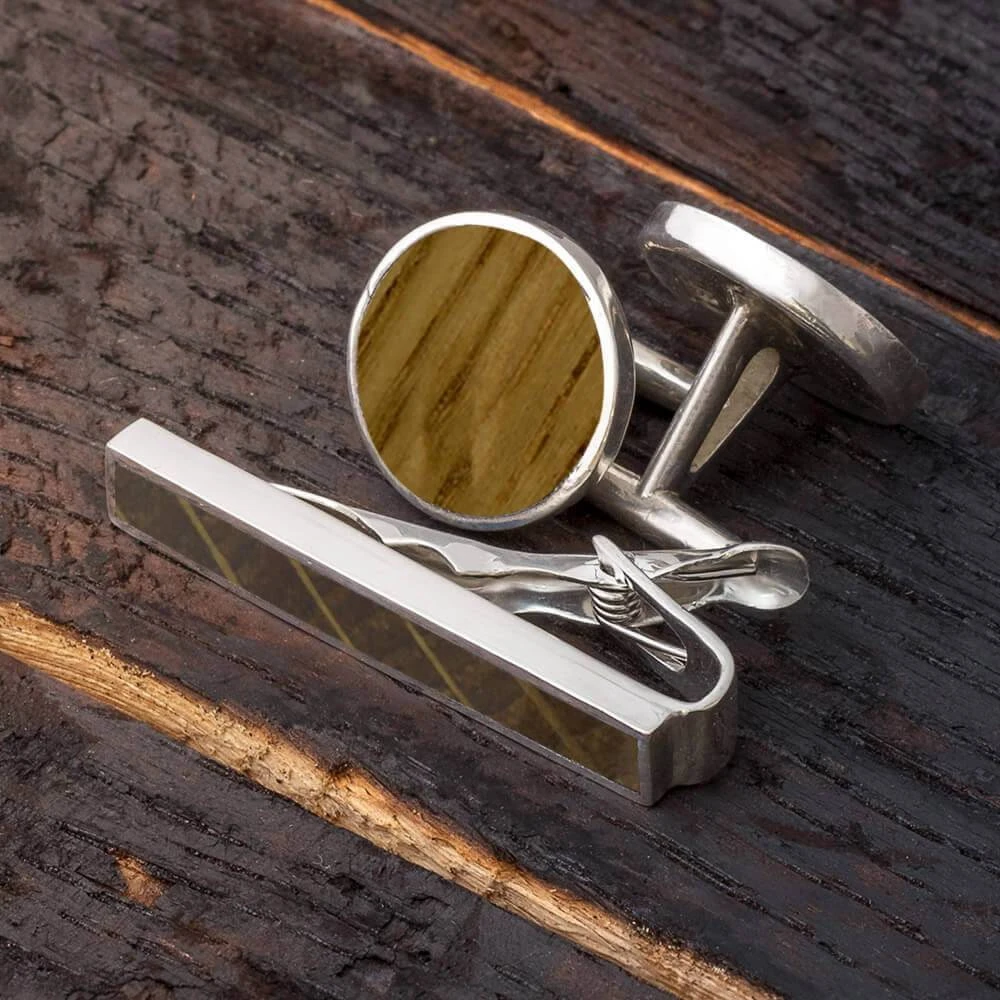 Raise a glass with this whiskey barrel oak wood cuff link and tie clip gift set! Crafted in polished silver, these handmade accessories add a colorful twist to any formal attire.