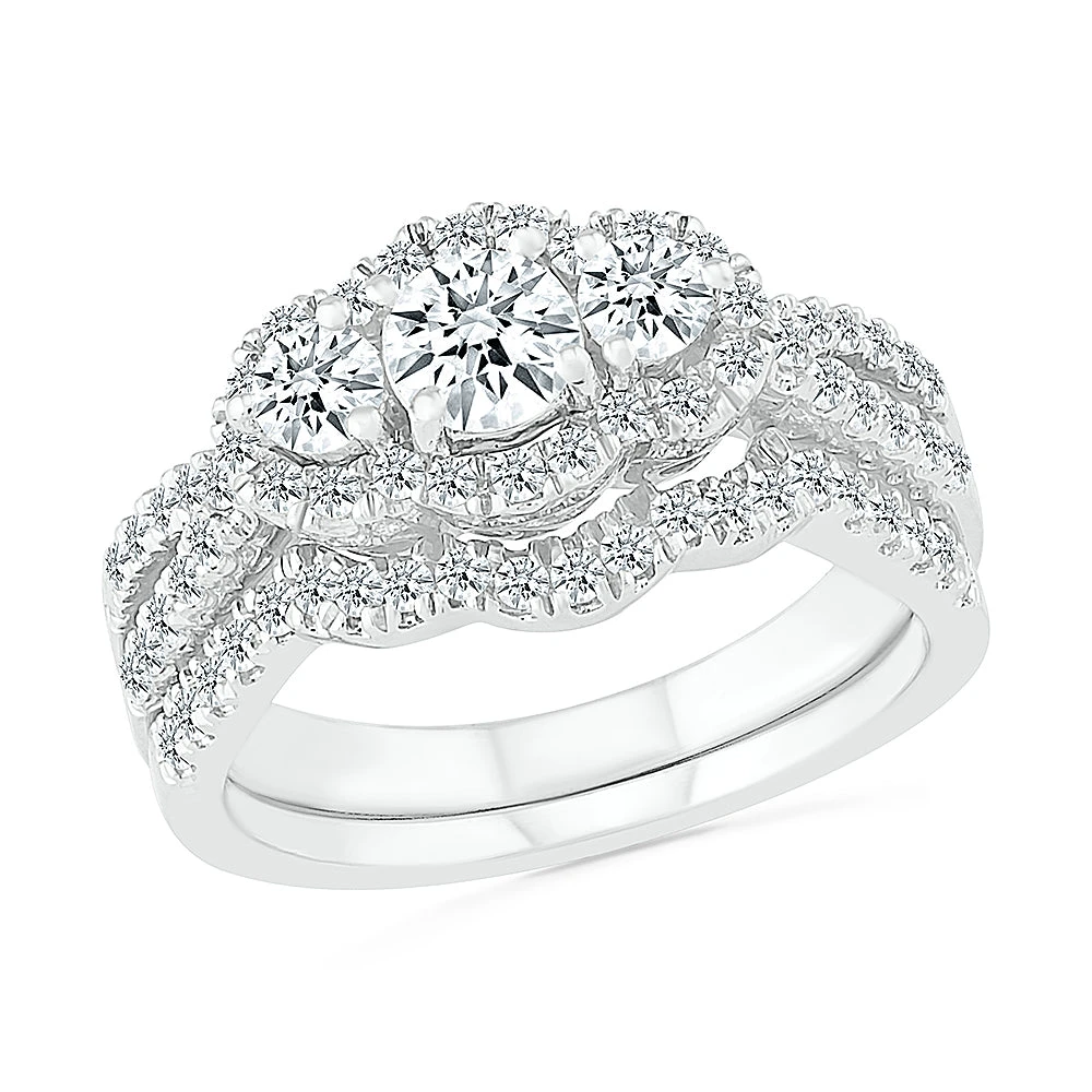 Shining with romantic symbolism, this three stone diamond ring set is a perfect way to start the rest of your lives together. Each stone represents the past, present and future of your love. Diamond accents decorate the band making it sparkle from all angles. A complementing wedding band is the finishing touch to this stunning, bridal set.