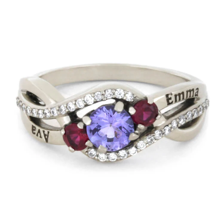 Give this 14k white gold and tanzanite engagement ring to her when you propose, or give it as a mother’s ring. This gemstone ring is engraved with two words on each side of the band along with a thin row of diamonds.