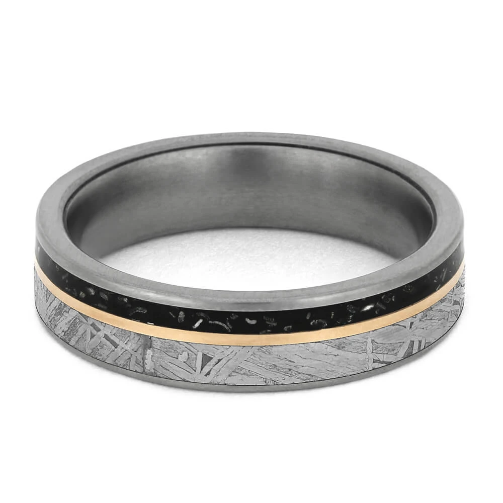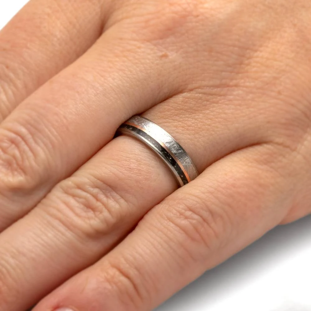 This meteorite wedding band has a dainty design with black stardust. A pinstripe of 14k rose gold cuts down the middle of this thin wedding band, bringing a bit of color to this simple yet stunning design.