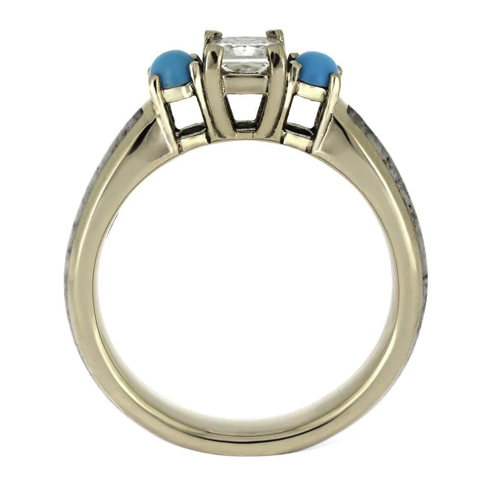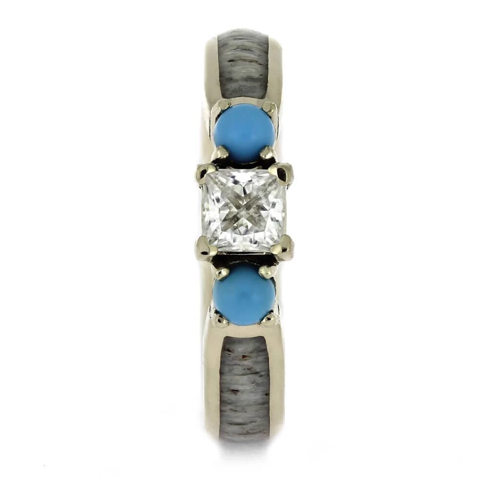 This 14k white gold diamond engagement ring showcases a dazzling square diamond and two round cabochon turquoise stones in a vivid blue hue. The band features naturally-shed antler in a stunning and authentic color.