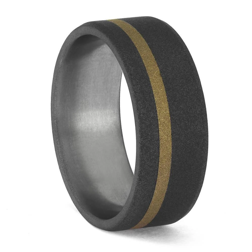 Designed with a timeless appeal that surpasses fleeting trends, this wedding band features a beveled profile, sandblasted finish, and 14k yellow gold pinstripe. This handmade all-metal ring can elevate any outfit, making it the perfect everyday accessory or wedding band choice.