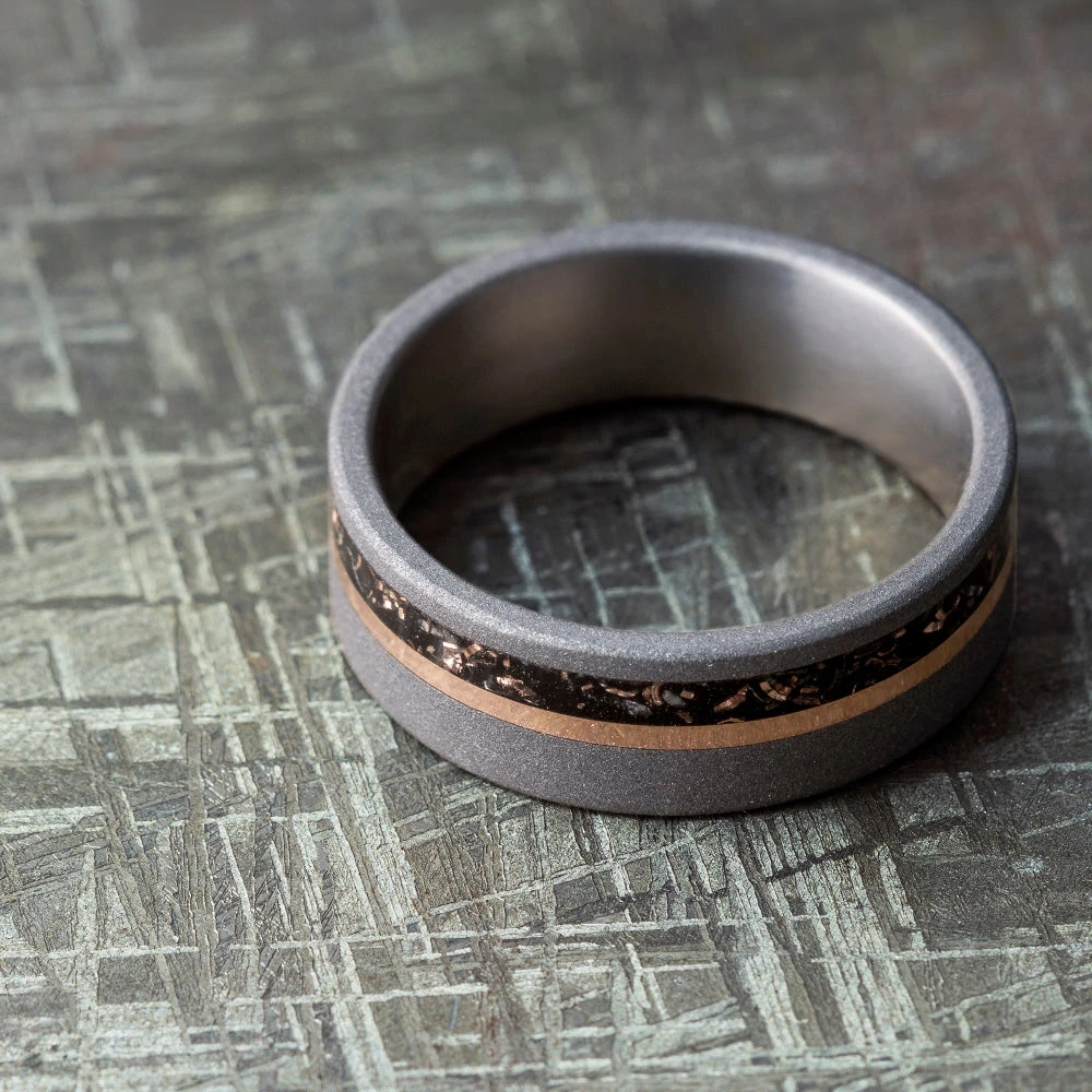 A uniquely colorful wedding band with black Stardust™ and a pinstripe of 14k rose gold surrounded by sandblasted titanium.