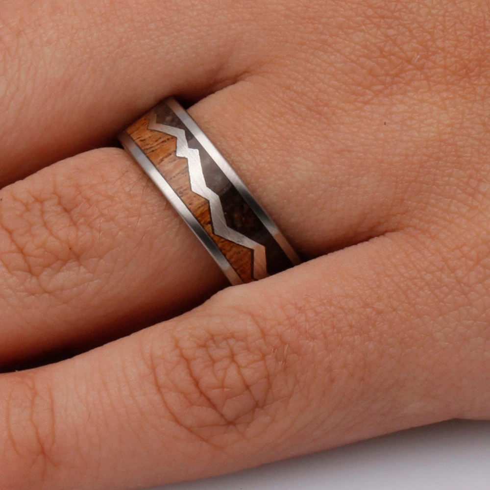 Sturdy as a mountain, this titanium ring has strong dark wood inlays complimenting the inlay on both sides. With the contrasting cherry burl and cocobolo woods, it shows off a more unique dark wood making it easily match any attire.