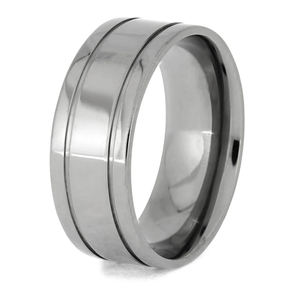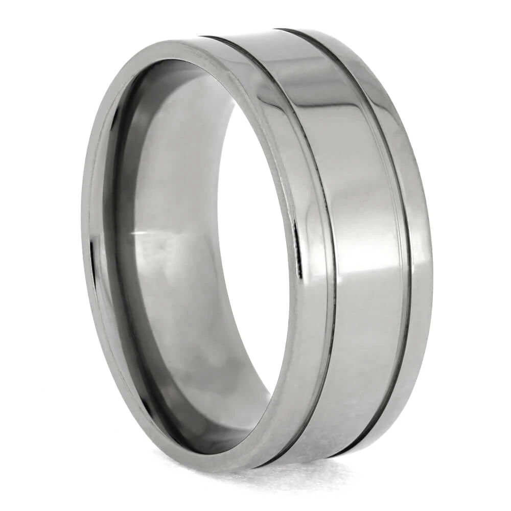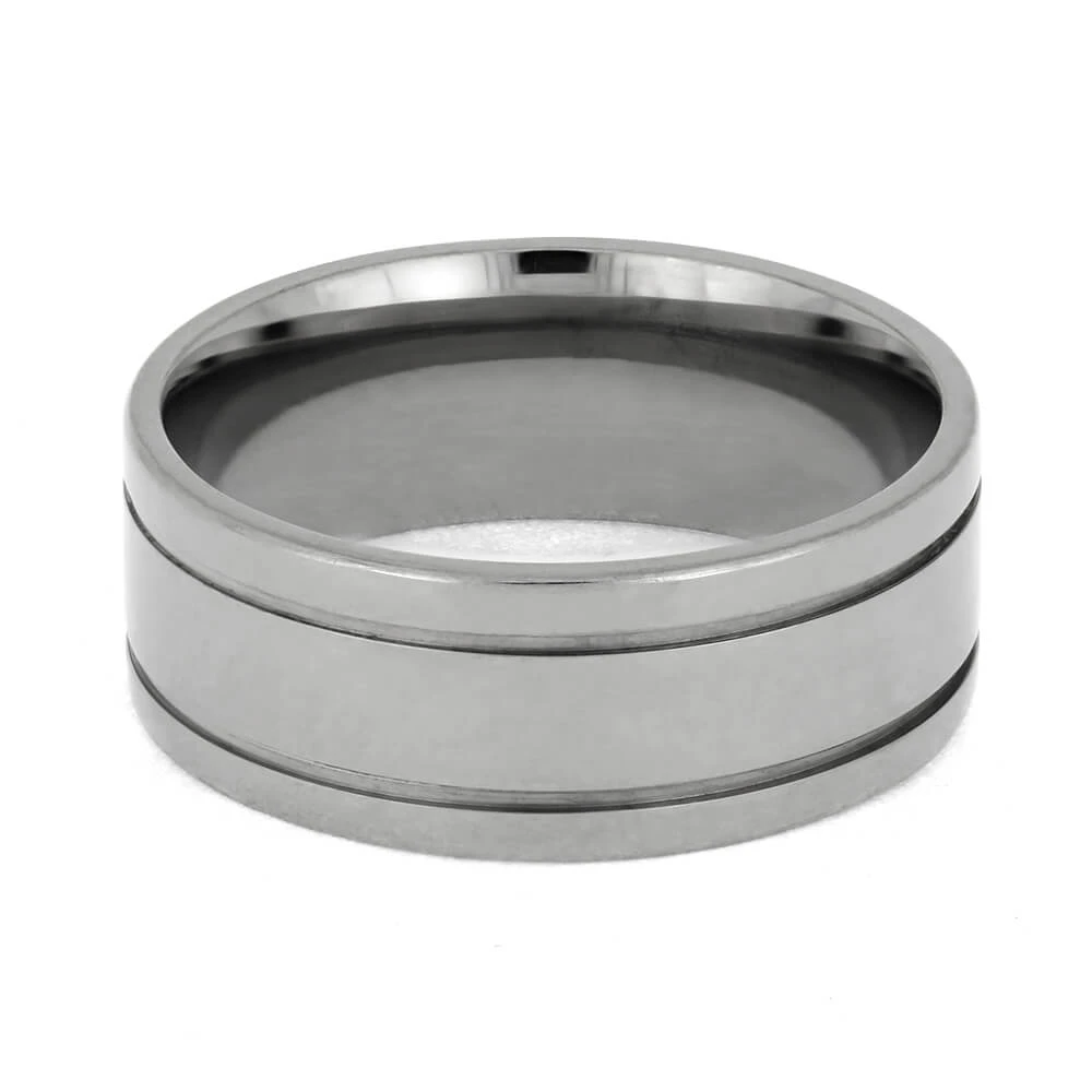 This solid titanium wedding band boasts a sleek comfort fit design, complete with a soft sleeve to ensure a cozy fit for your finger. Two pinstripe grooves add a subtle touch of elegance to this modern minimalist style, perfect for any contemporary wedding.