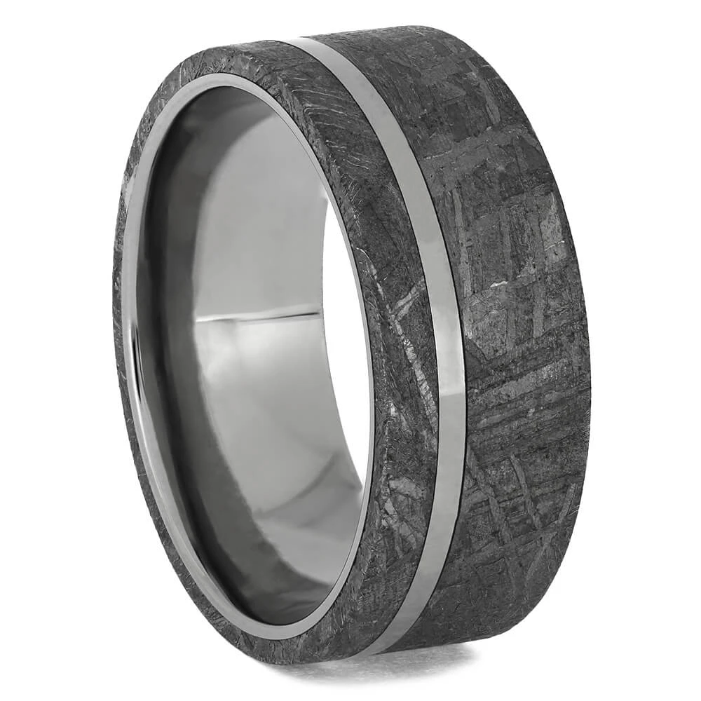 Keep a piece of outer space close at hand with this handmade meteorite ring! This titanium wedding band is crafted with a meteorite overlay for a space-inspired look.