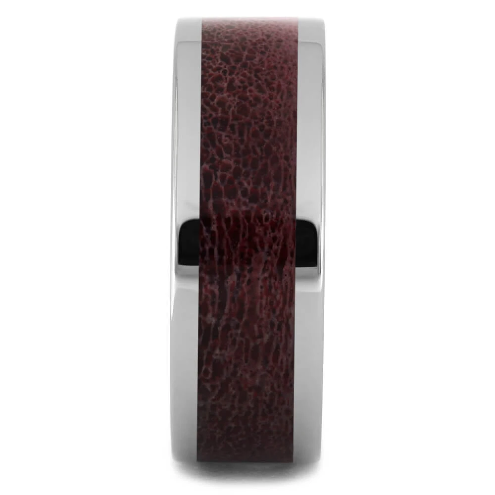 Warm tones shine in the colorful red deer antler of this polished titanium band. Ring armor waterproofing is included so the antler will never be compromised.