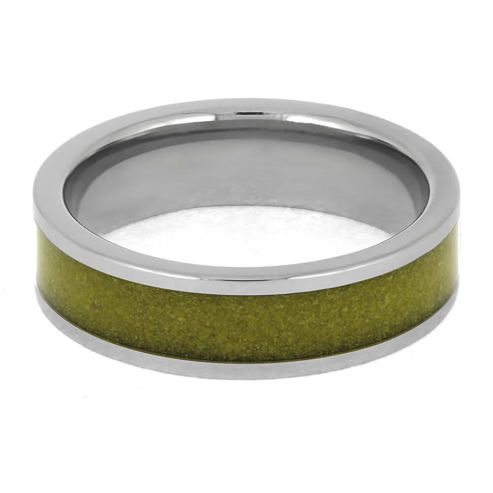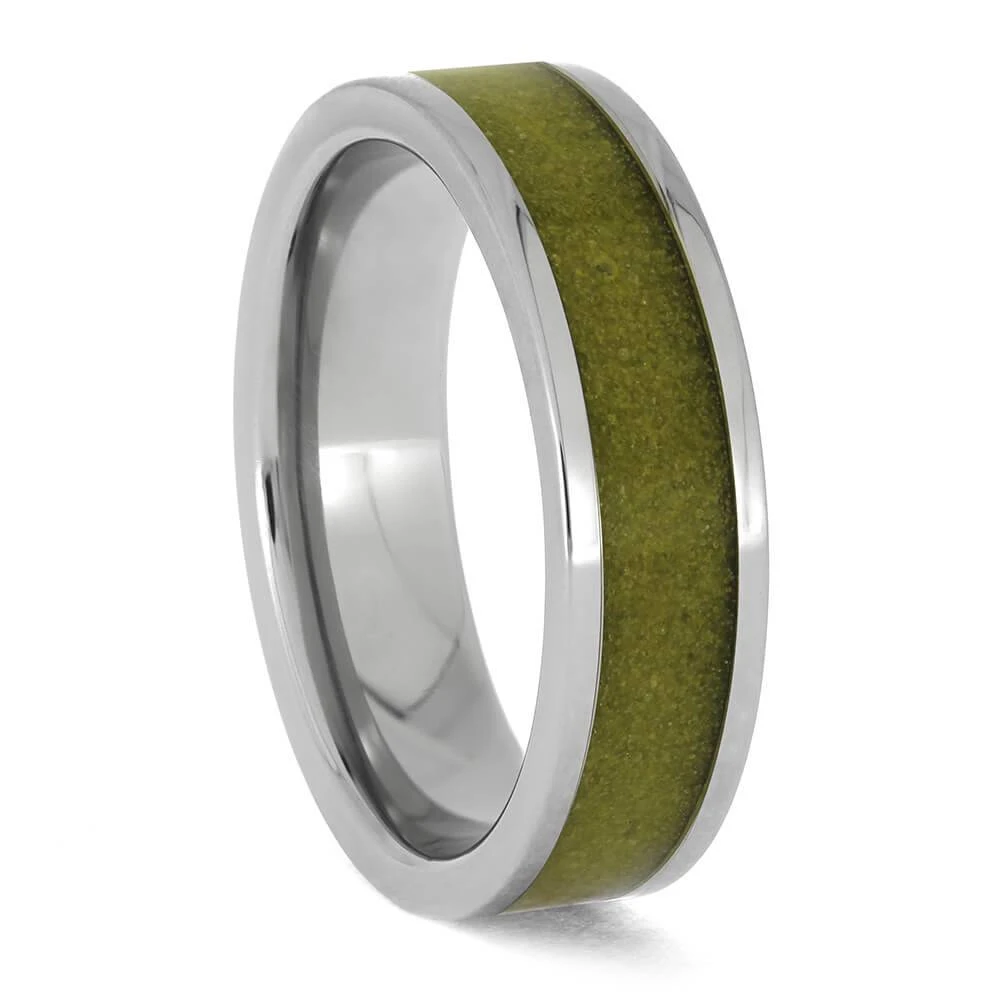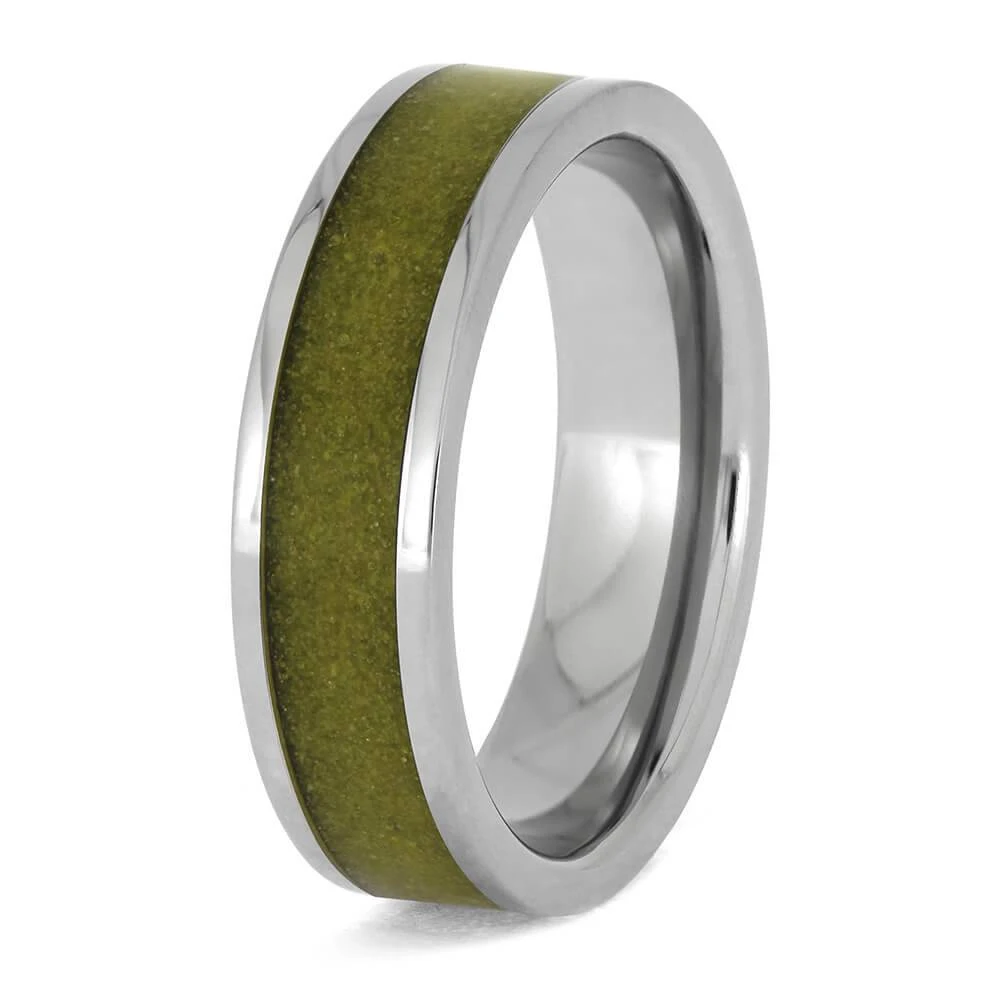 Discover the subtle elegance of nature with this meticulously crafted titanium wedding band featuring a beautiful yellow sand inlay. The polished design perfectly accentuates the sand’s natural texture and luster, making it a unique and sophisticated choice for your special day.
