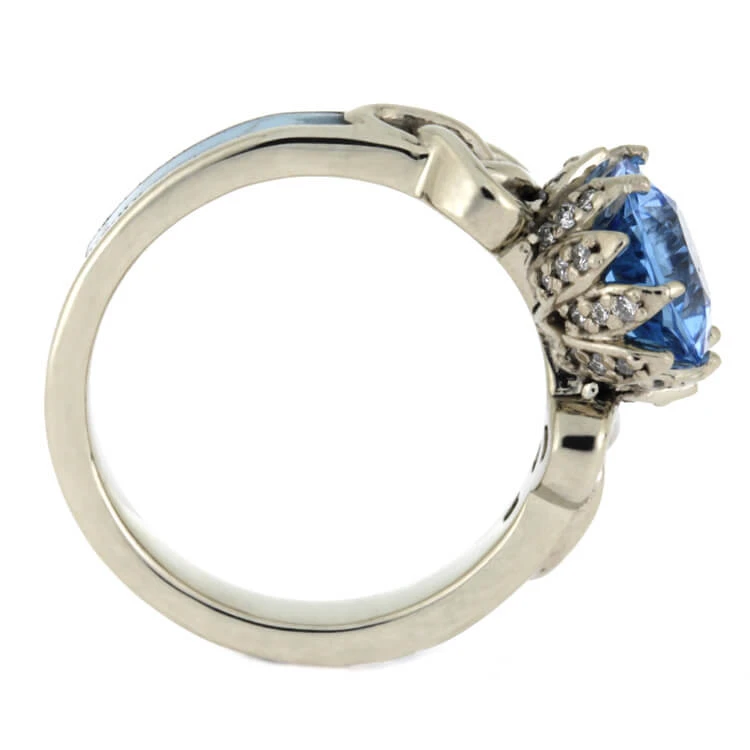 Diamonds, Kingman blue turquoise, and a pair of solid 14k white gold Celtic knot designs adorn this colorful topaz engagement ring. The eye-catching lotus setting hosts a genuine Swiss blue topaz, which matches the turquoise inlays and compliments the diamond side stones.