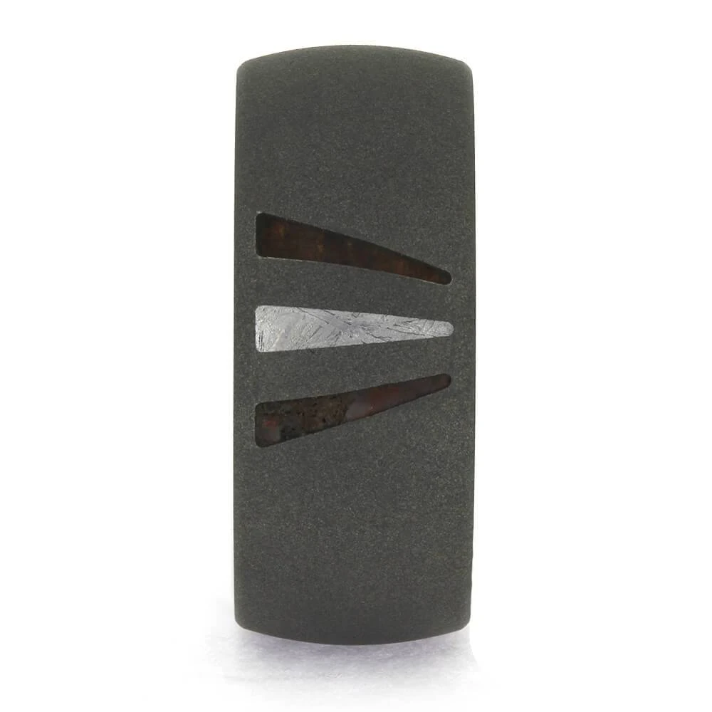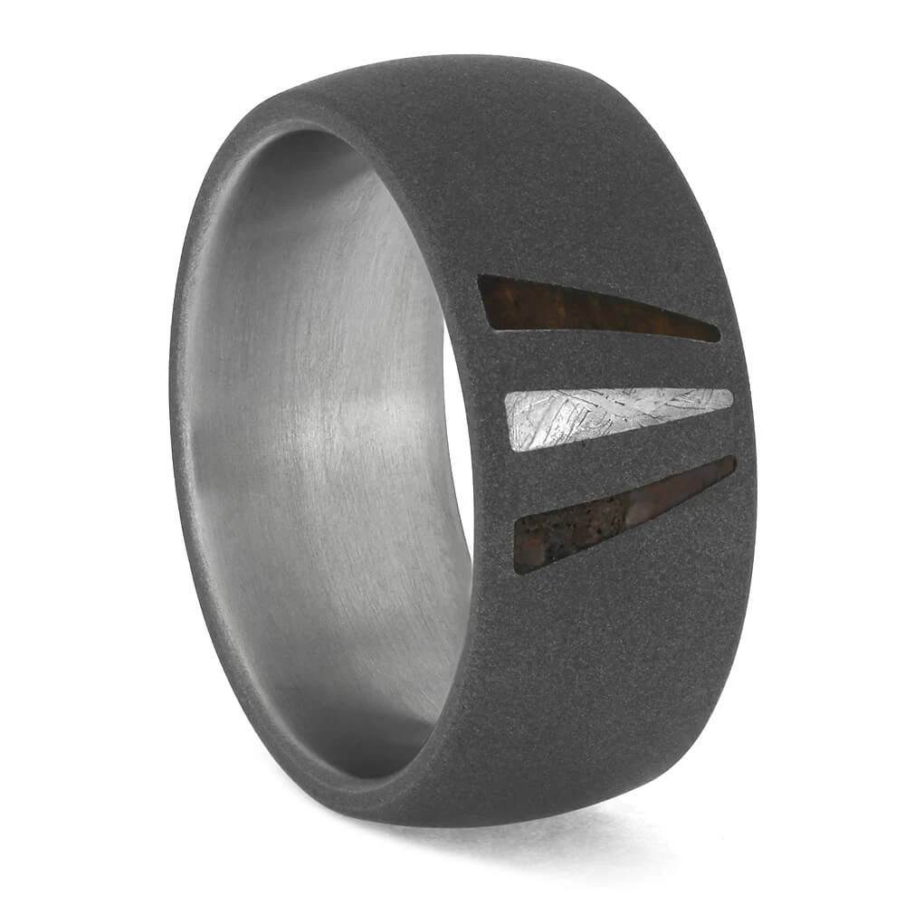 Expertly crafted from the finest natural materials, this titanium wedding band boasts triple inlays of meteorite, ironwood, and fossilized dinosaur bone. Each inlay holds unique significance, and for a truly personalized touch, you can request additional materials or provide your own for an even more meaningful ring.