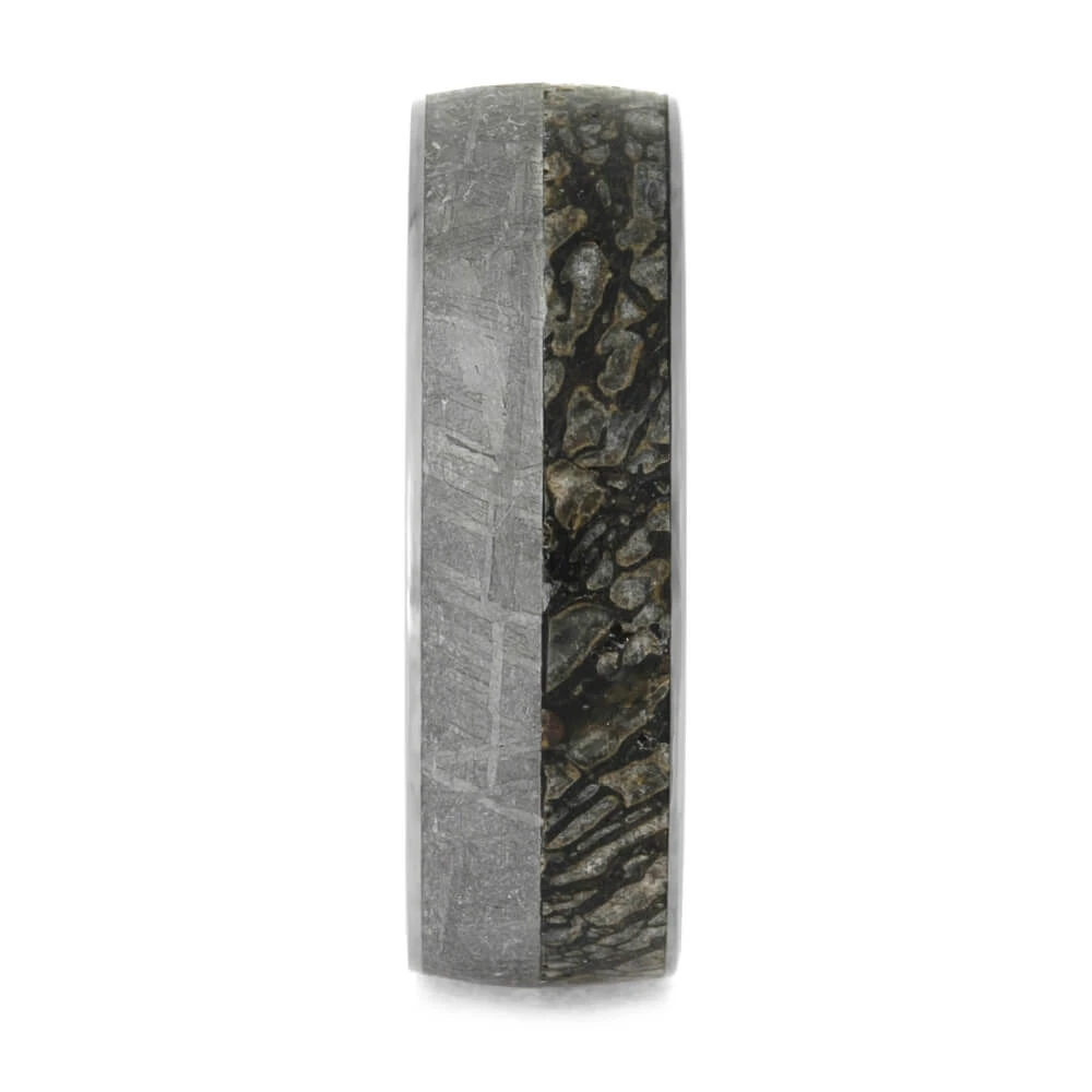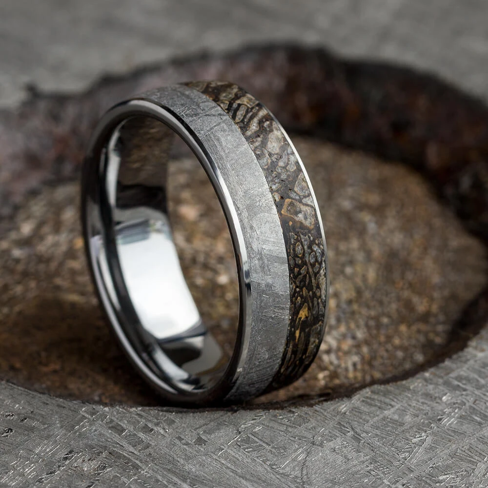 You’re sure to love wearing and showing off the intricate details in this tungsten fossil ring! Containing large inlays of Gibeon meteorite and dinosaur bone, this handmade ring is the ultimate conversation piece. The exotic materials are perfect for space and geology enthusiasts!