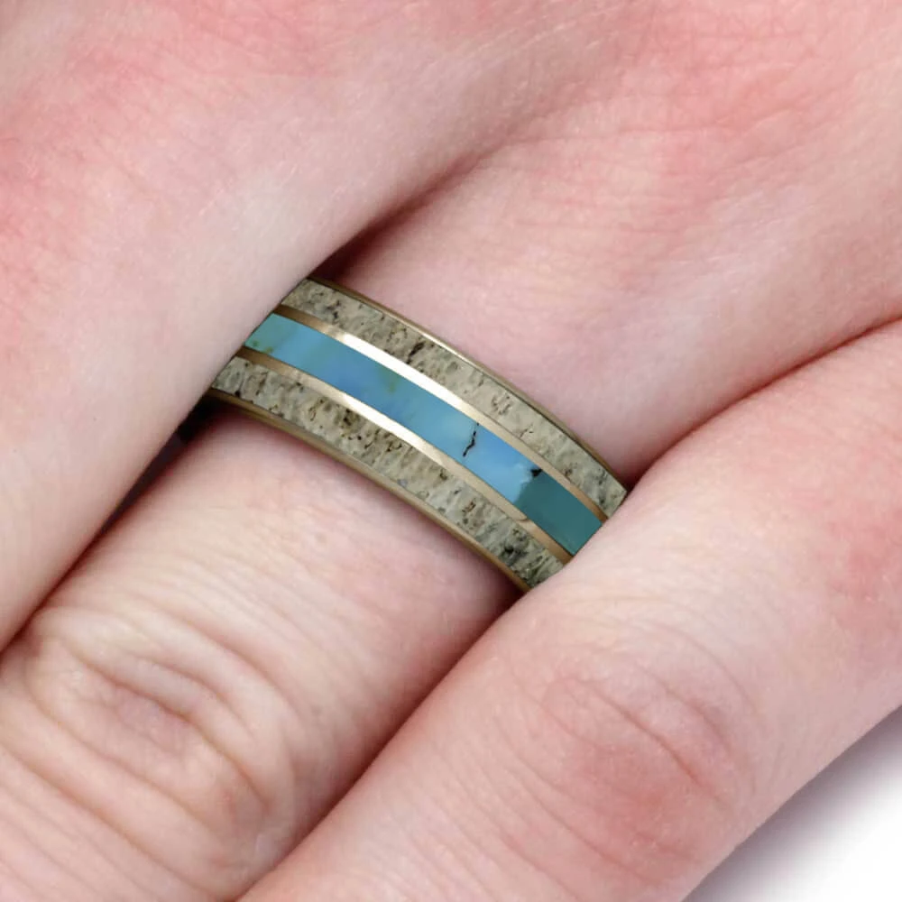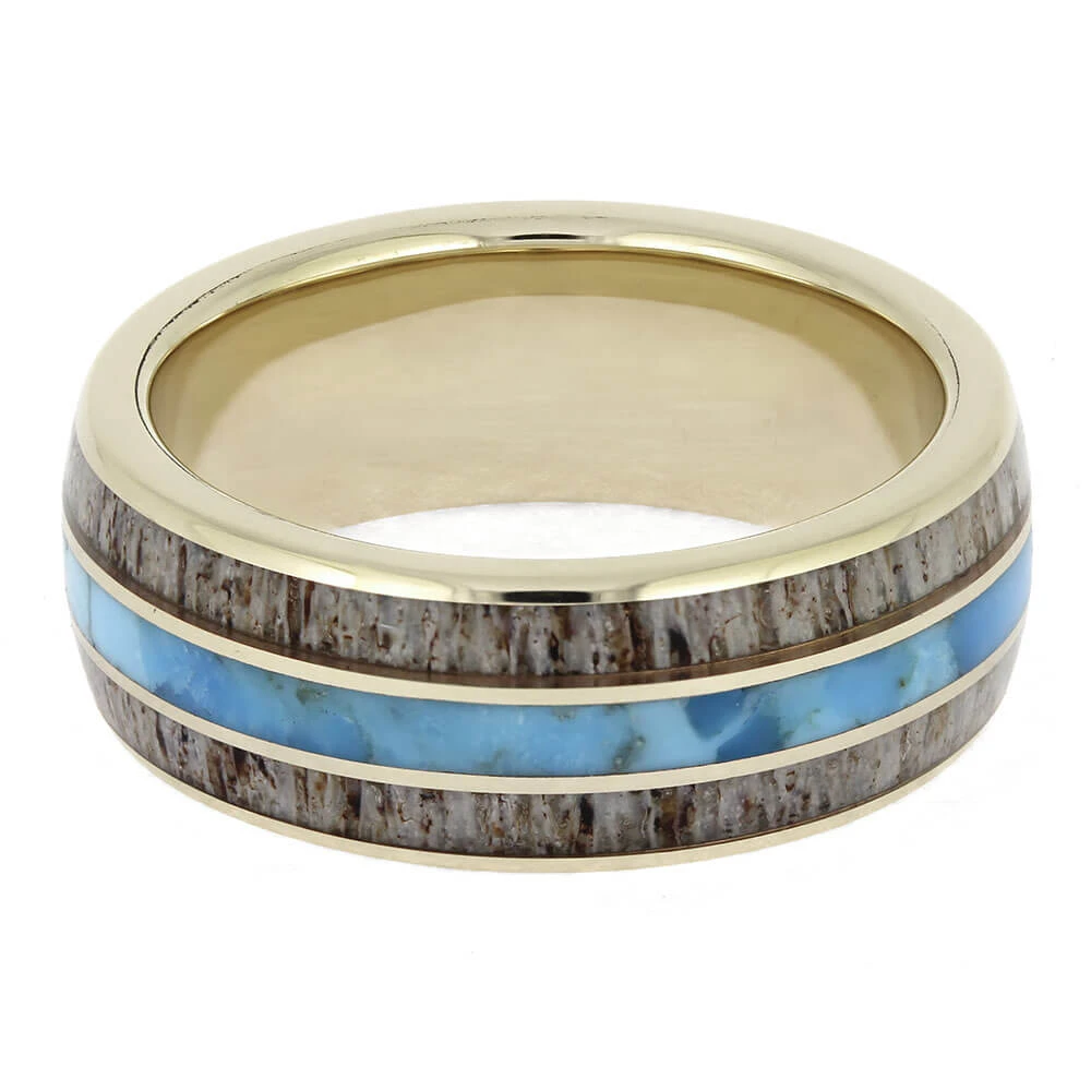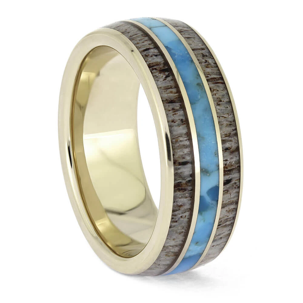 Show off an extraordinary fusion of natural elements with this turquoise and deer antler wedding band. This men’s ring combines a meticulously-selected Kingman turquoise inlay with naturally-shed deer antler, enhanced by refined 14k white gold pinstripe detailing.