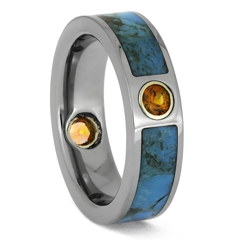 This men’s wedding band features striking turquoise inlays, securely framed by sturdy titanium edges. Two orange sapphires sit in 14k white gold bezel settings to complete this ring’s spectacular look. The durable construction and unique design make it a standout choice for any groom. Contact Us if you’d like to customize the gemstones or design of this ring!