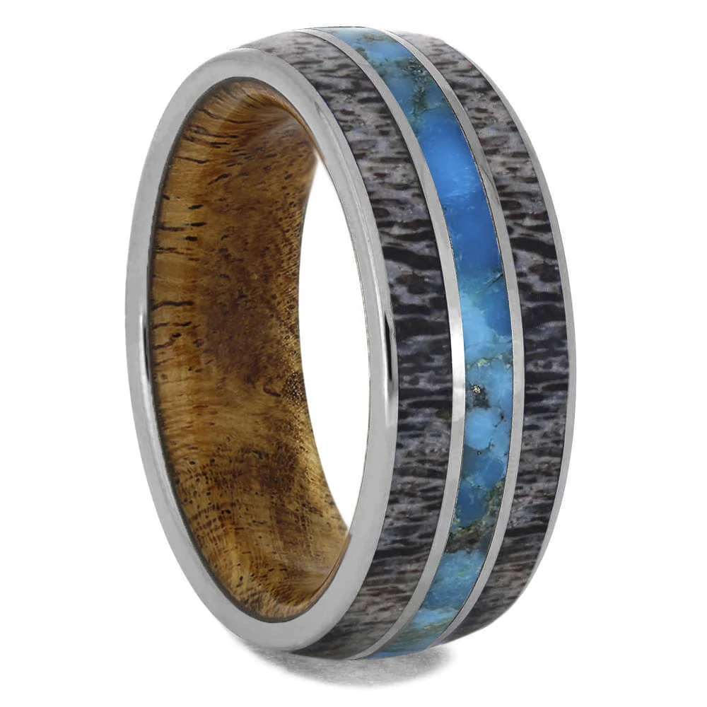 Organic materials are special in their own right because of their one of a kind nature. A turquoise inlay is surrounded by genuine antler inlays, while a mesquite wood sleeve lies beneath. The three magnificent materials in this turquoise men’s wedding band all have distinct characteristics that will never go unnoticed.