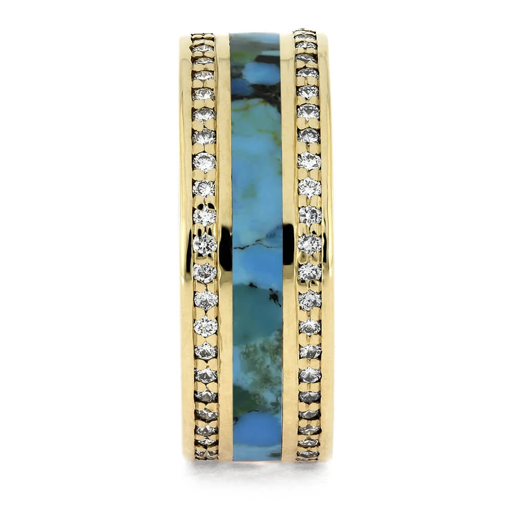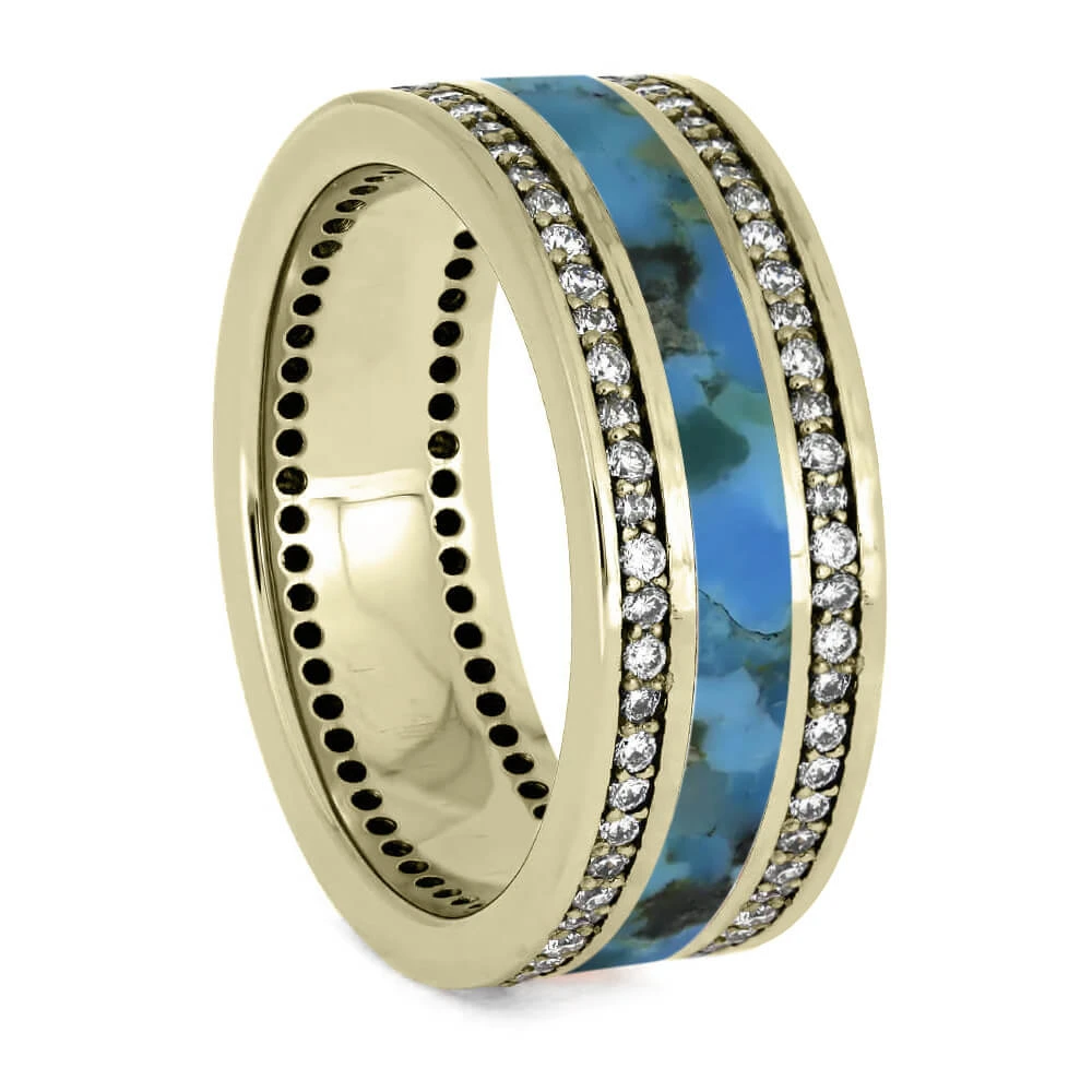 This Kingman blue turquoise wedding band is decorated with two eternity bands on each side filled with sparkling, natural diamonds. Celebrate your wedding or anniversary with this 14k white gold ring to represent your undying love.