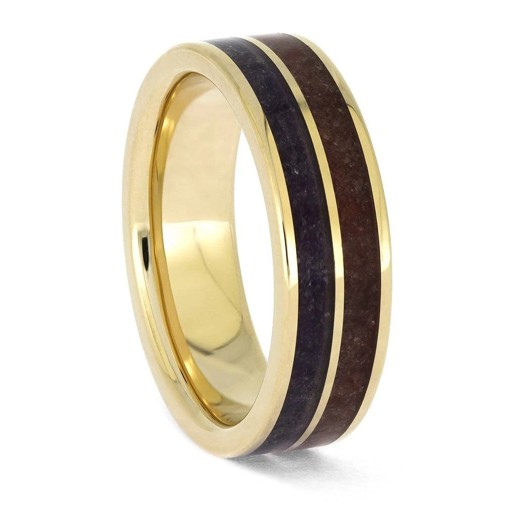 Wear a symbol of you and your significant other with this double birthstone wedding band. This handmade ring is crafted in solid 14k yellow gold and features a classic polished finish. This ring features crushed red ruby (July) and purple amethyst (February) stones; contact us to personalize the birthstone inlays in this design today!