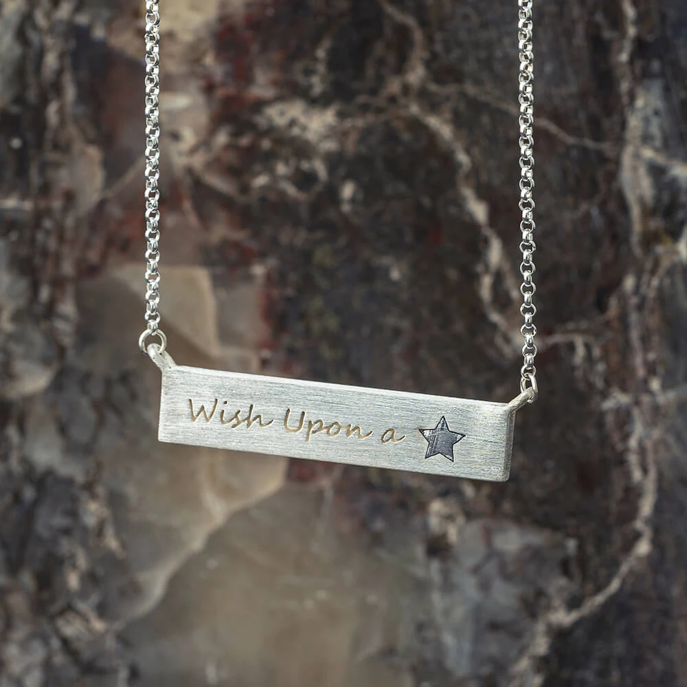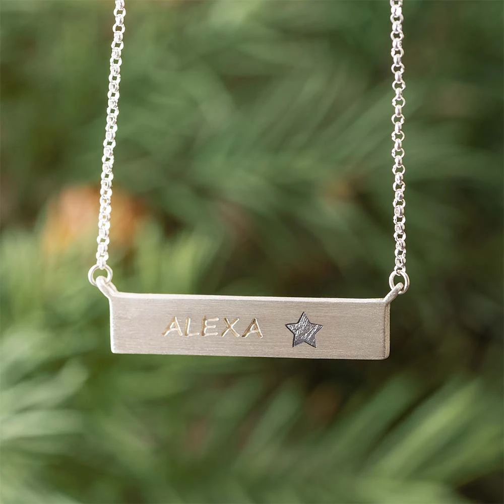 This meteorite bar pendant necklace is made with sterling silver and has meteorite star. Purchase this pendant necklace for anyone who is looking to add a unique and stellar look to their jewelry collection.